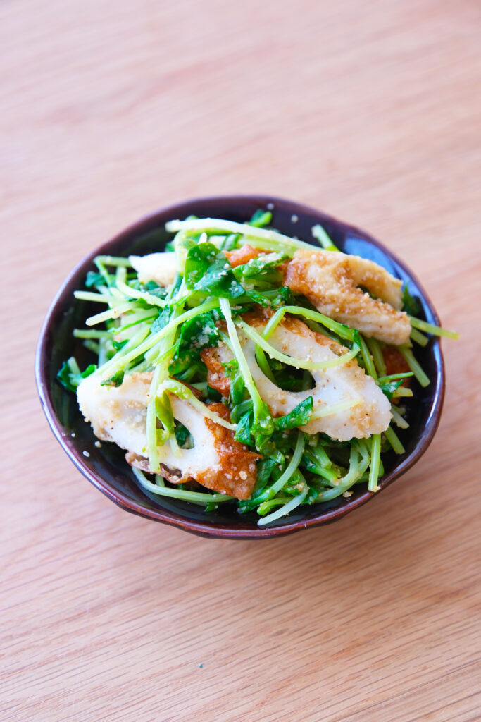 豆苗は根元を切り落とし、長さ半分に切る。ちくわは5mm厚の斜め切りにする。