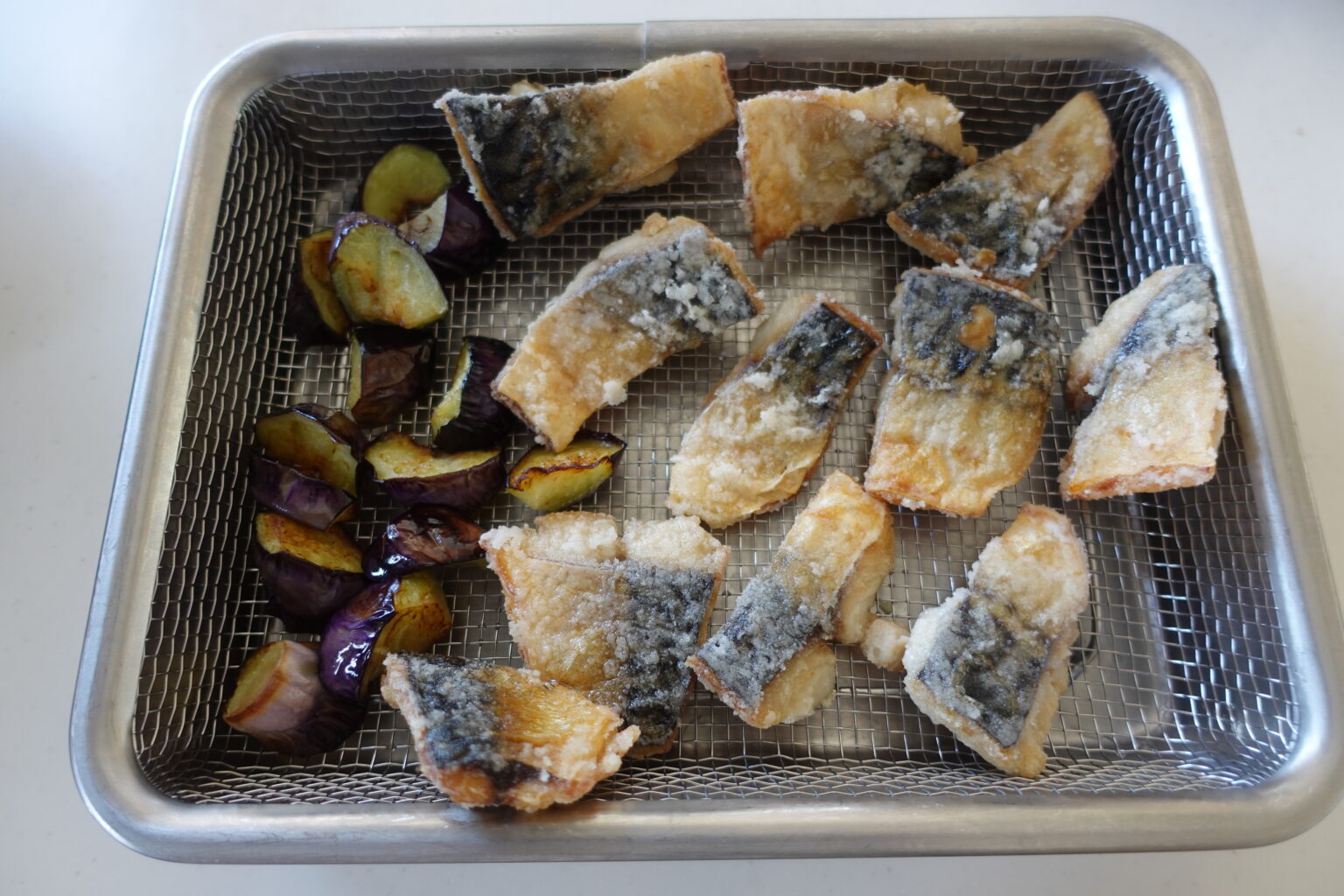塩サバ(半身)は表面についている水分をペーパーでふき取る。食べやすい大きさに切り、片栗粉をまぶす。なすと同じように、さばを揚げ焼きにし、網付きバットにあげて油切りする。