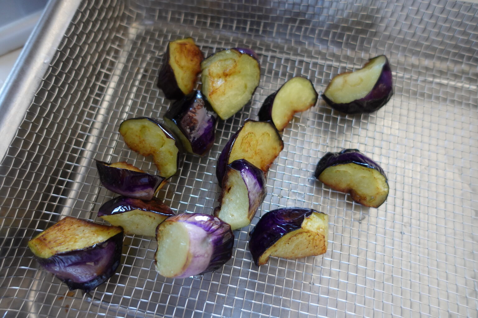 ・茄子を彩り鮮やかに仕上げるポイントは皮面から揚げること。きれいな紫色になります。