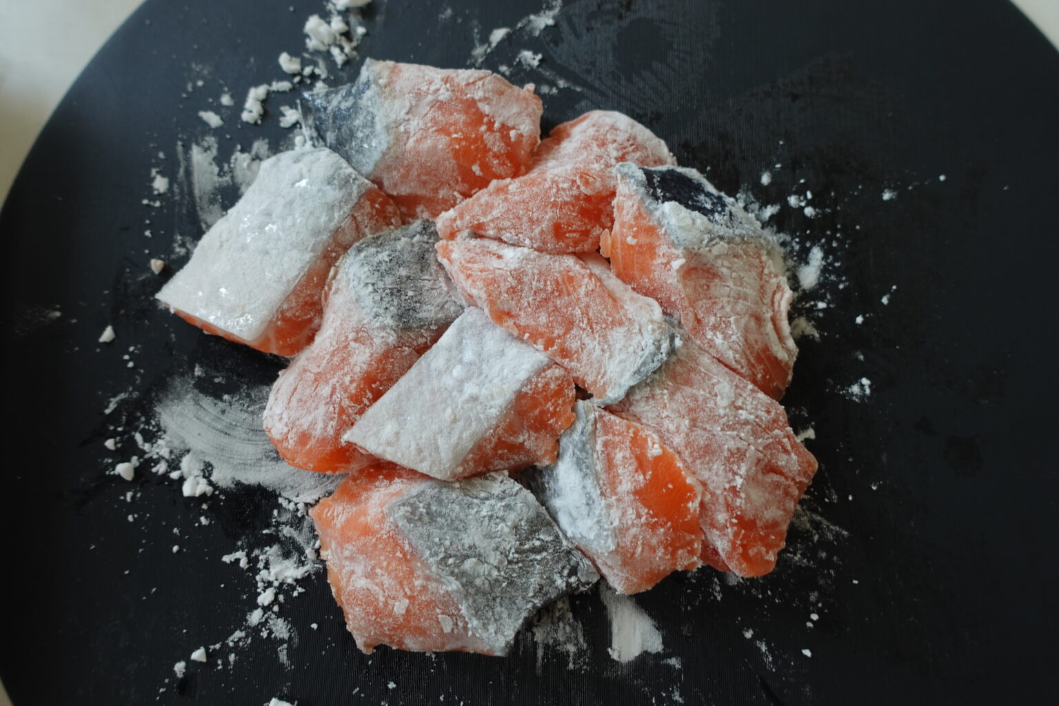 鮭は表面についている水分をペーパータオルでふき取り、一口大に切る。片栗粉をまぶす。