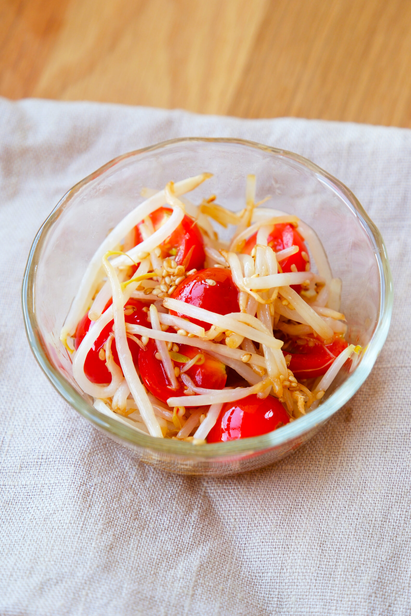 シャキッとしたもやしと、みずみずしいトマトの食感が楽しいさっぱりナムルです♪ごま油の香りとにんにくの風味が食欲をそそります◎火を使わずに電子レンジだけで作れるので、暑い日やあと一品ほしいときにもぴったり!ぜひ作ってみてくださいね。