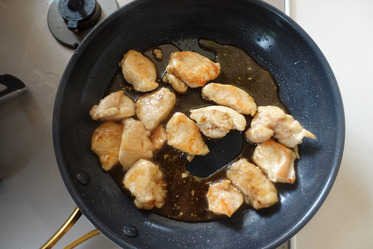フライパンに油を熱し、鶏肉の皮目を下にして中火で炒める。皮がこんがりと焼けたら、裏返す。