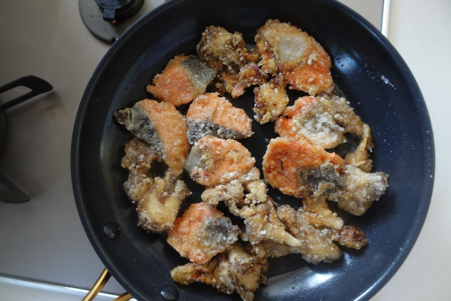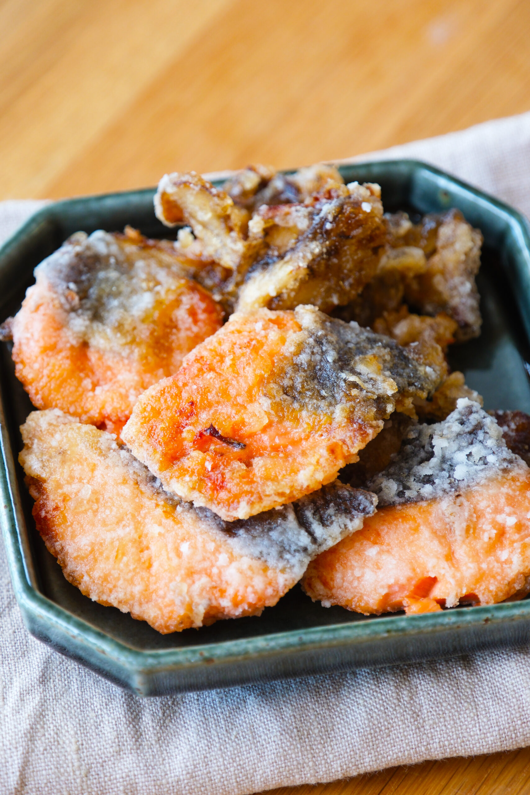 外はカリッと♪中はジューシー♪今夜の晩ごはんは鮭の竜田揚げはいかがでしょうか。秋らしく舞茸も添えて。鮭の豊かな旨味とまいたけの香りがとってもおいしい一品です。ご飯のおかずにはもちろん、ビールのおつまみにもぴったり◎冷めても美味しいのでお弁当に入れても大活躍です♪少ない油でカリッと香ばしい竜田揚げに仕上がりますのでぜひお試しくださいね。
