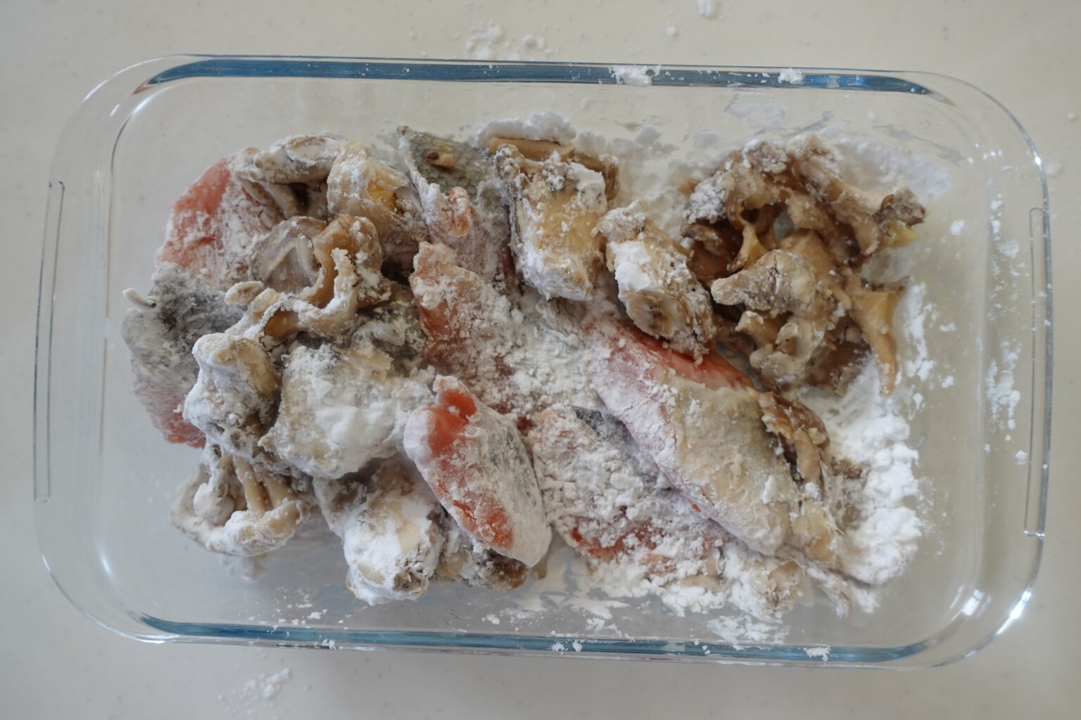 鮭の切り身(骨抜き)はキッチンペーパーで表面についた水分を拭き取り、一口大に切る。まいたけは食べやすい大きさにほぐす。ビニール袋に鮭とまいたけとAを入れて揉みこむ。汁気を切って、片栗粉をまぶす。