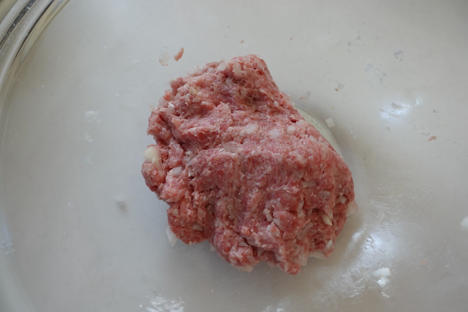 玉ねぎはみじん切りにする。ボウルに牛豚合いびき肉とAを合わせて手早くこねる。玉ねぎを加えてさらに混ぜる。