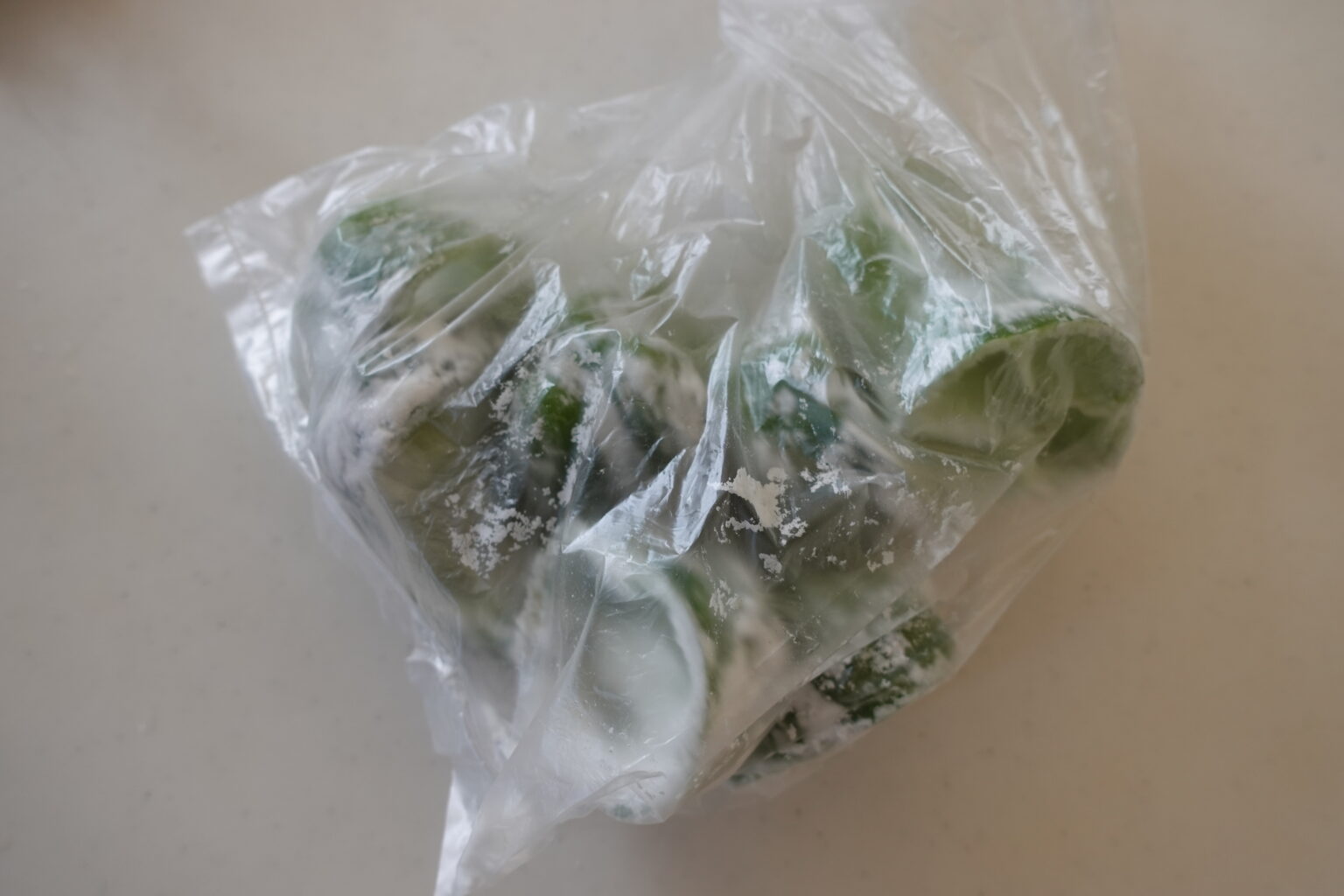 ピーマンは3等分の輪切りにしてたねをとり除く。水気をふき取り、ビニール袋にピーマンと片栗粉を入れてふりふりしながら全体にまぶす。