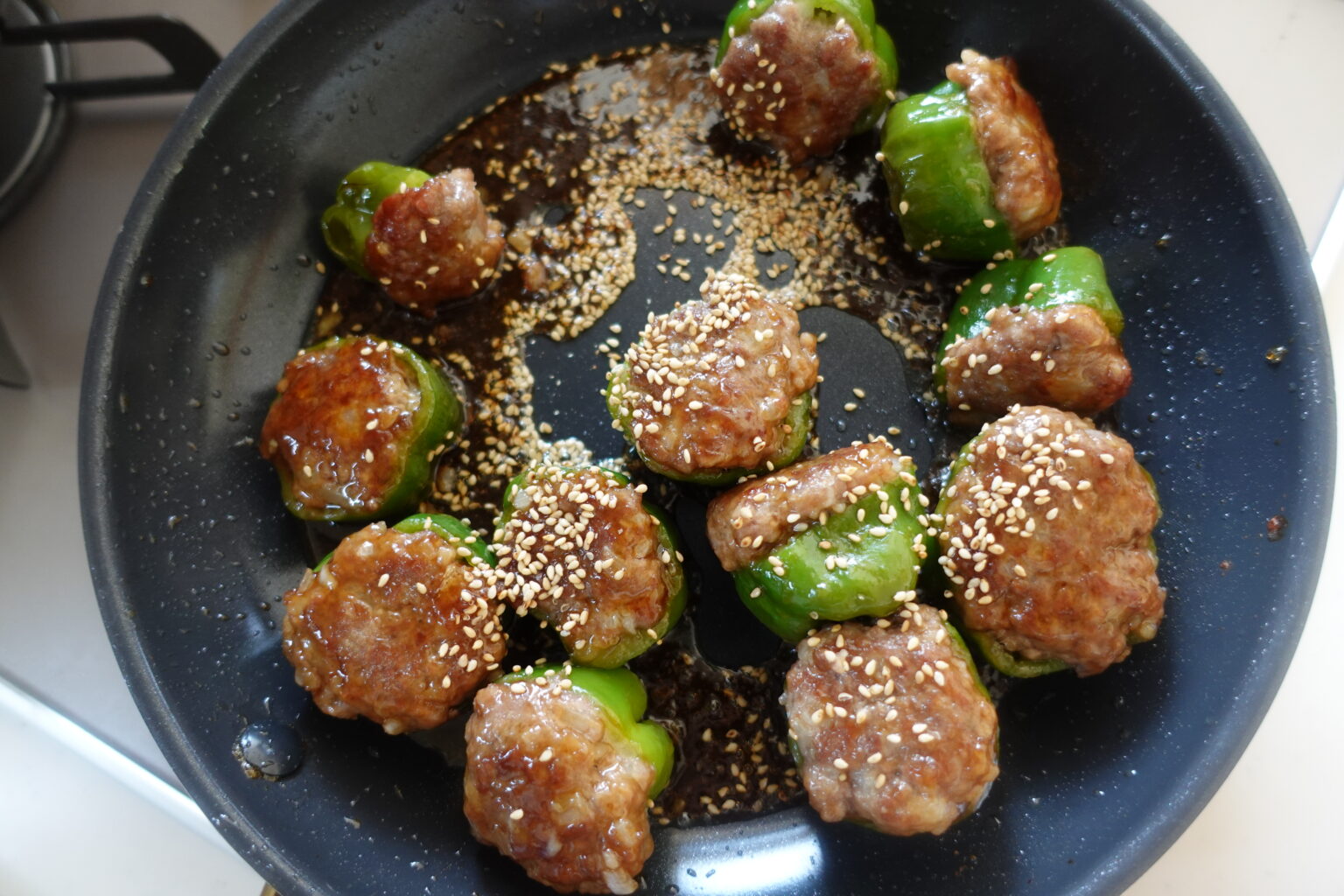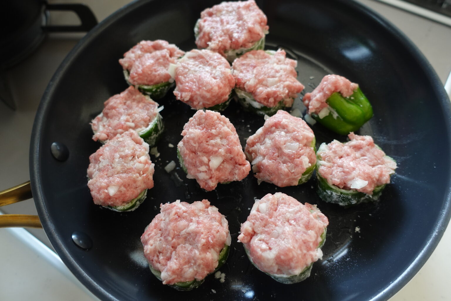 フライパンに薄く油をひき、2を並べる。ピーマンの中に1を詰めて、火にかける。中火で両面に焼き目をつける。