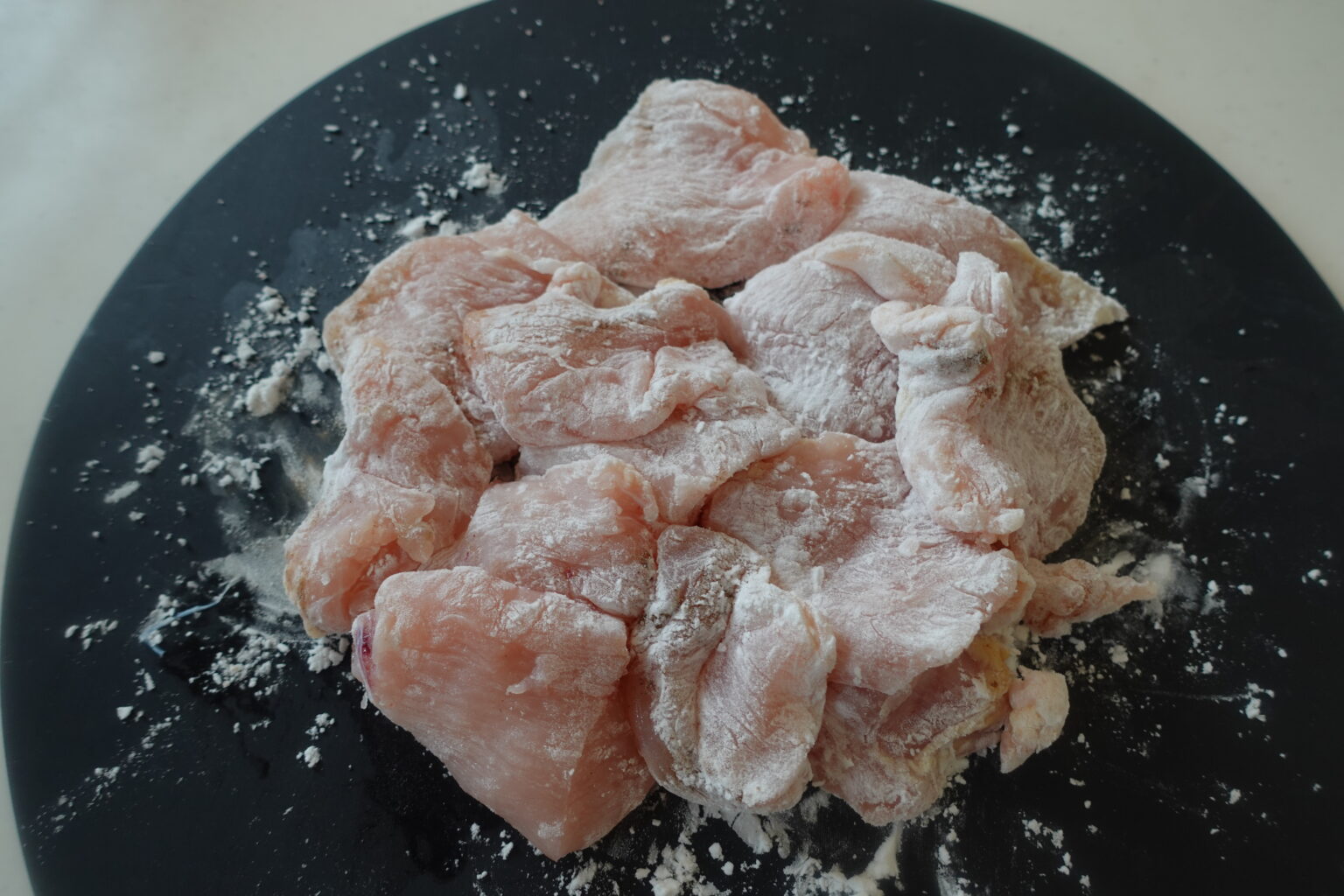 鶏むね肉は表面についている水分をキッチンペーパーでふき取り、一口大のそぎ切りにする。塩こしょうをして、鶏肉の皮を伸ばしながら片栗粉をまぶす。