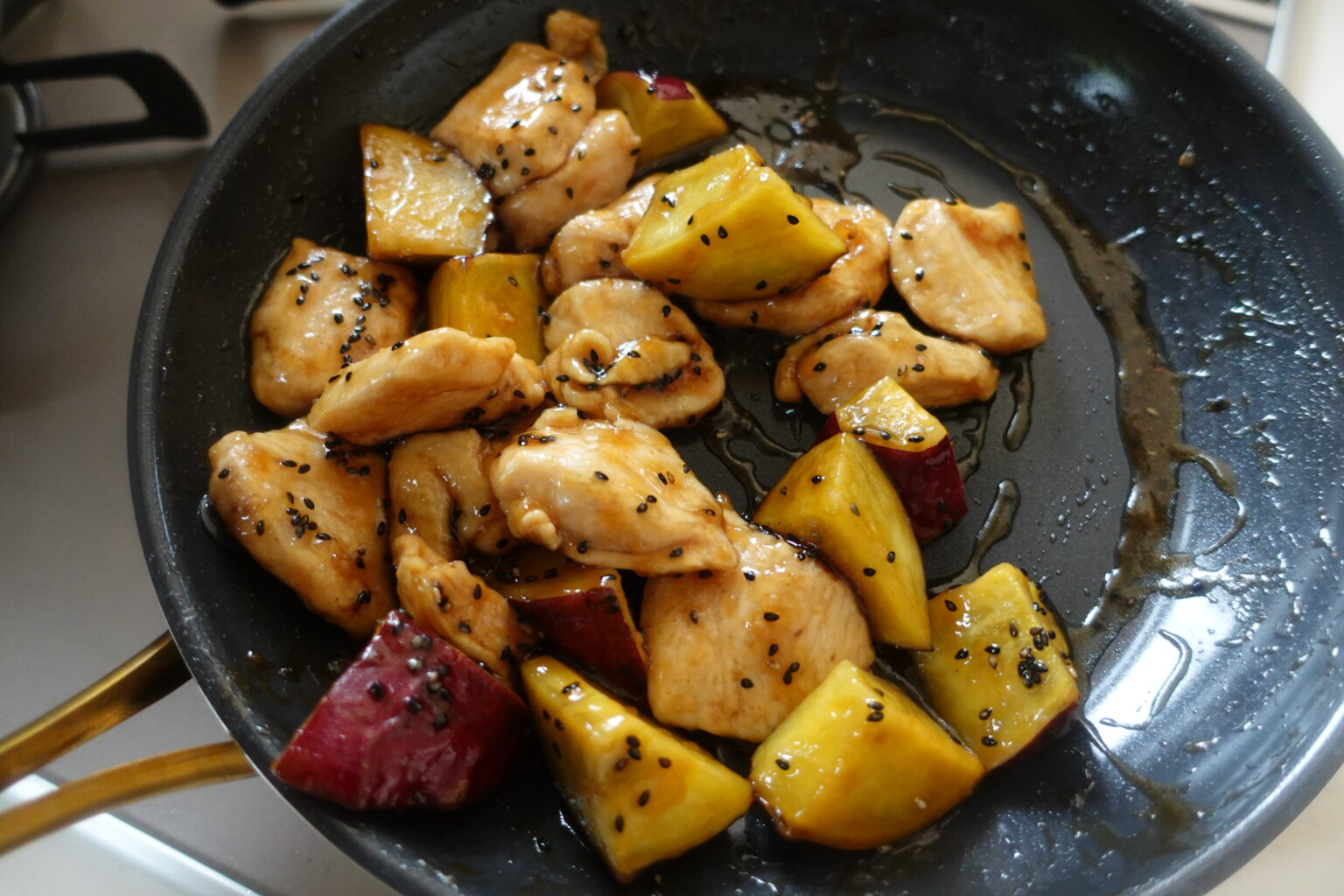 両面に焼き目がつき中まで火が通ったらさつまいもを加えてさっと炒める。ペーパータオルで余分な油をふきとる。