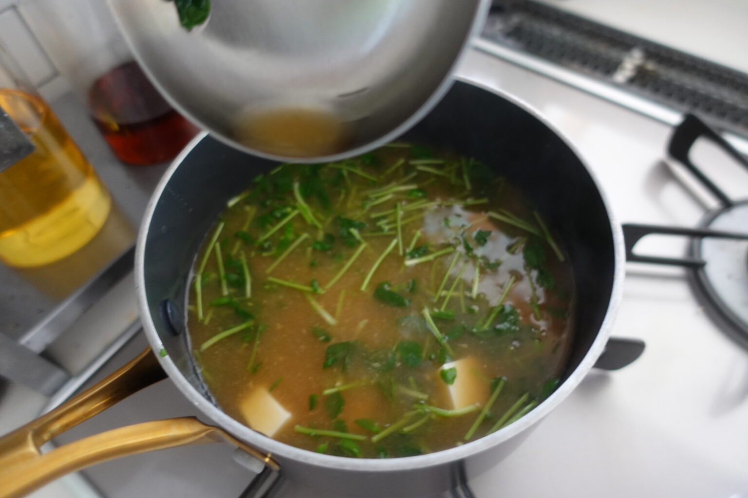 パックだしを取り出して、豆腐と豆苗を加えてさっと煮て、弱火にして味噌を溶きいれる。