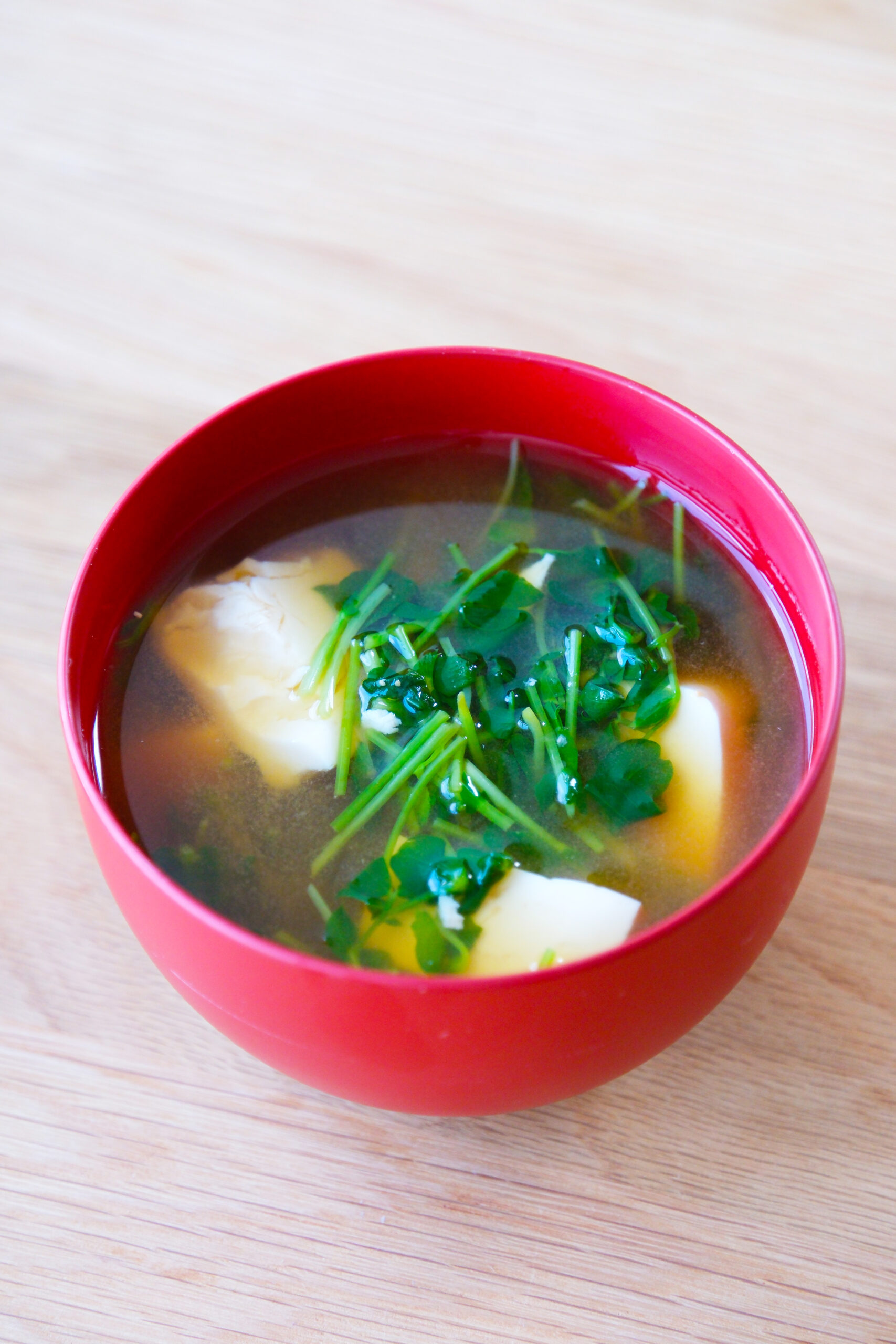 パックだしを取り出して、豆腐と豆苗を加えてさっと煮て、弱火にして味噌を溶きいれる。