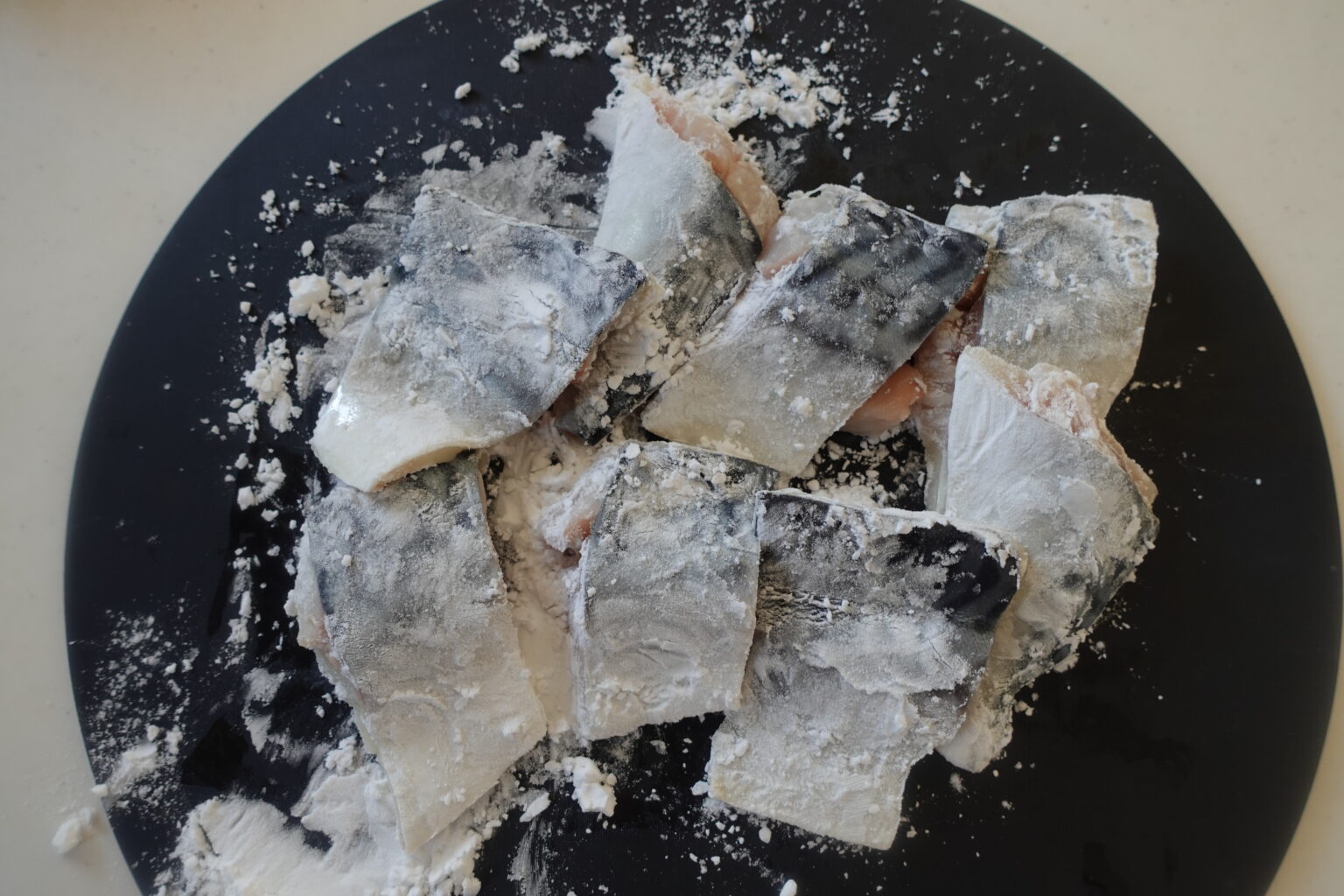 塩サバ(半身)は表面についている水分をペーパーでふき取り、ひと口大に切る。片栗粉をまぶす。