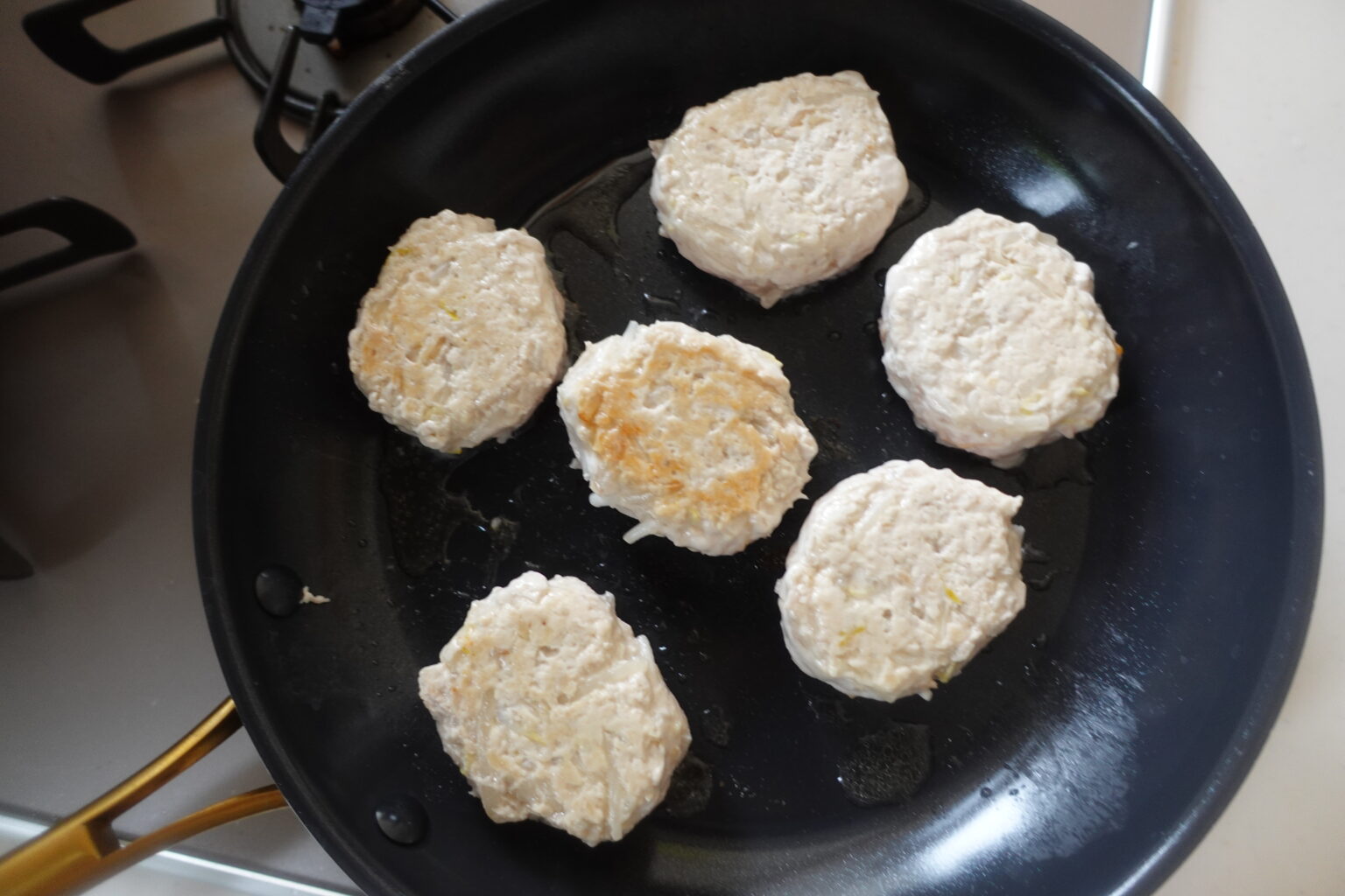 肉だねを6等分にして楕円形に成形し、油をひいたフライパンに並べる。