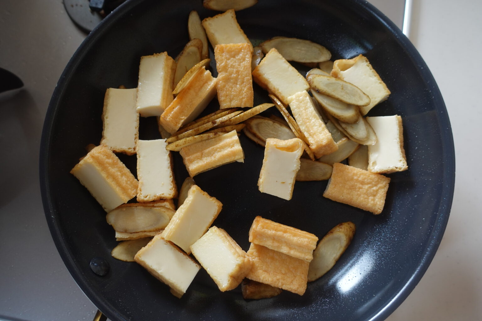 フライパンにごま油を熱し、ごぼうを入れて中火で炒める。火が通ったら厚揚げを加え、表面に焼き色をつけるように炒める。
