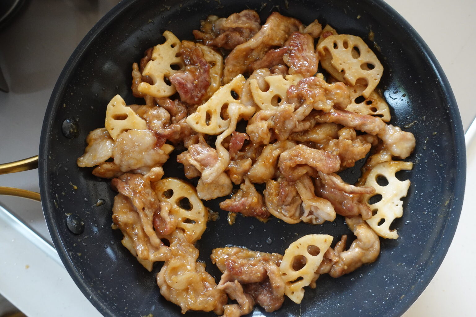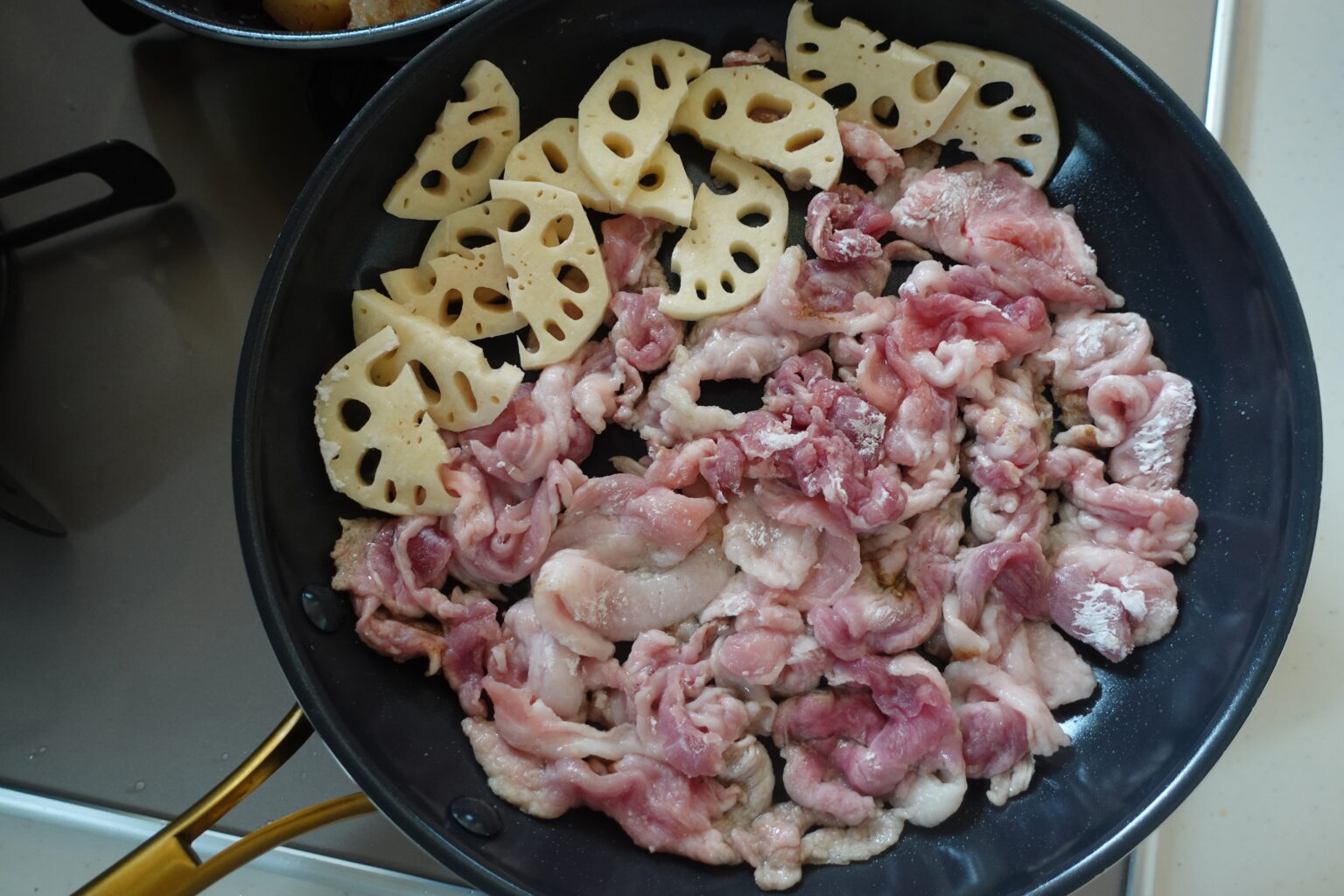 フライパンに油を熱し、豚こま肉とれんこんを並べて中火で炒める。