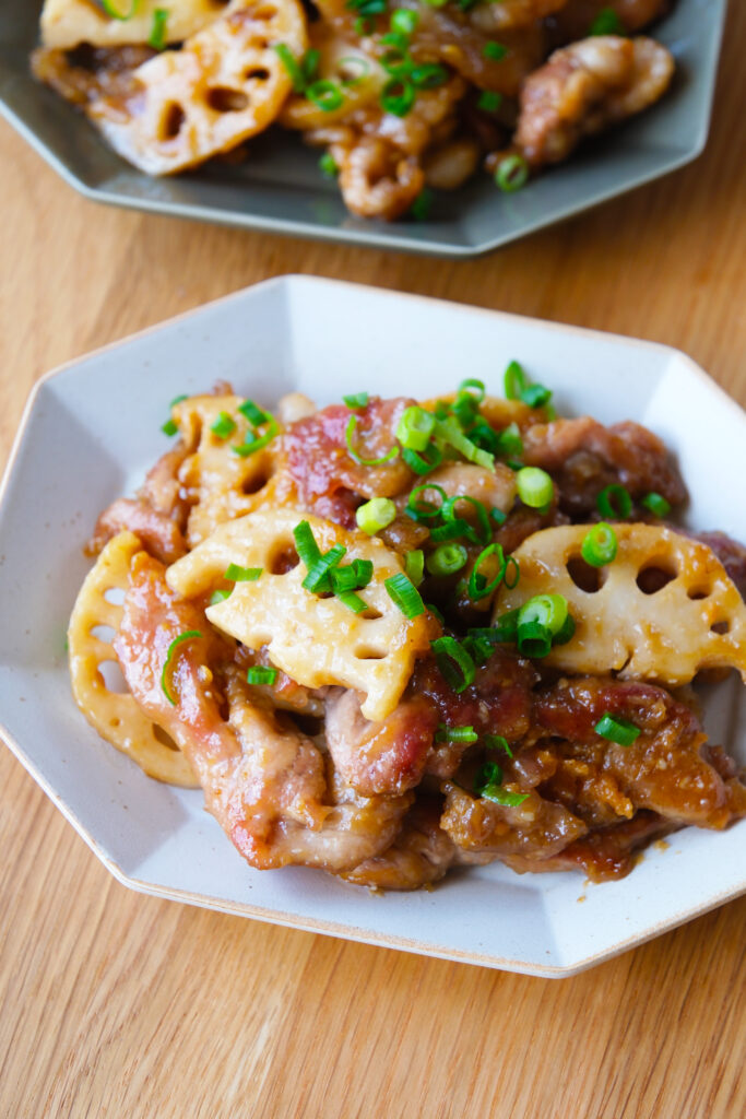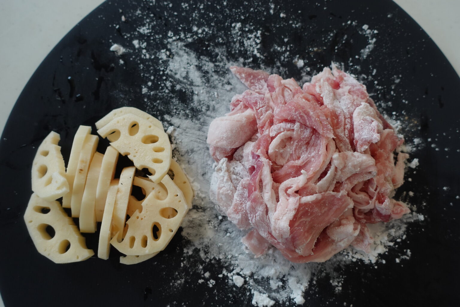 豚こま肉は塩こしょうで下味をつけ、食べやすくちぎりながら片栗粉をまぶす。れんこんはピーラーで皮をむき、5mm幅の半月切りにする。