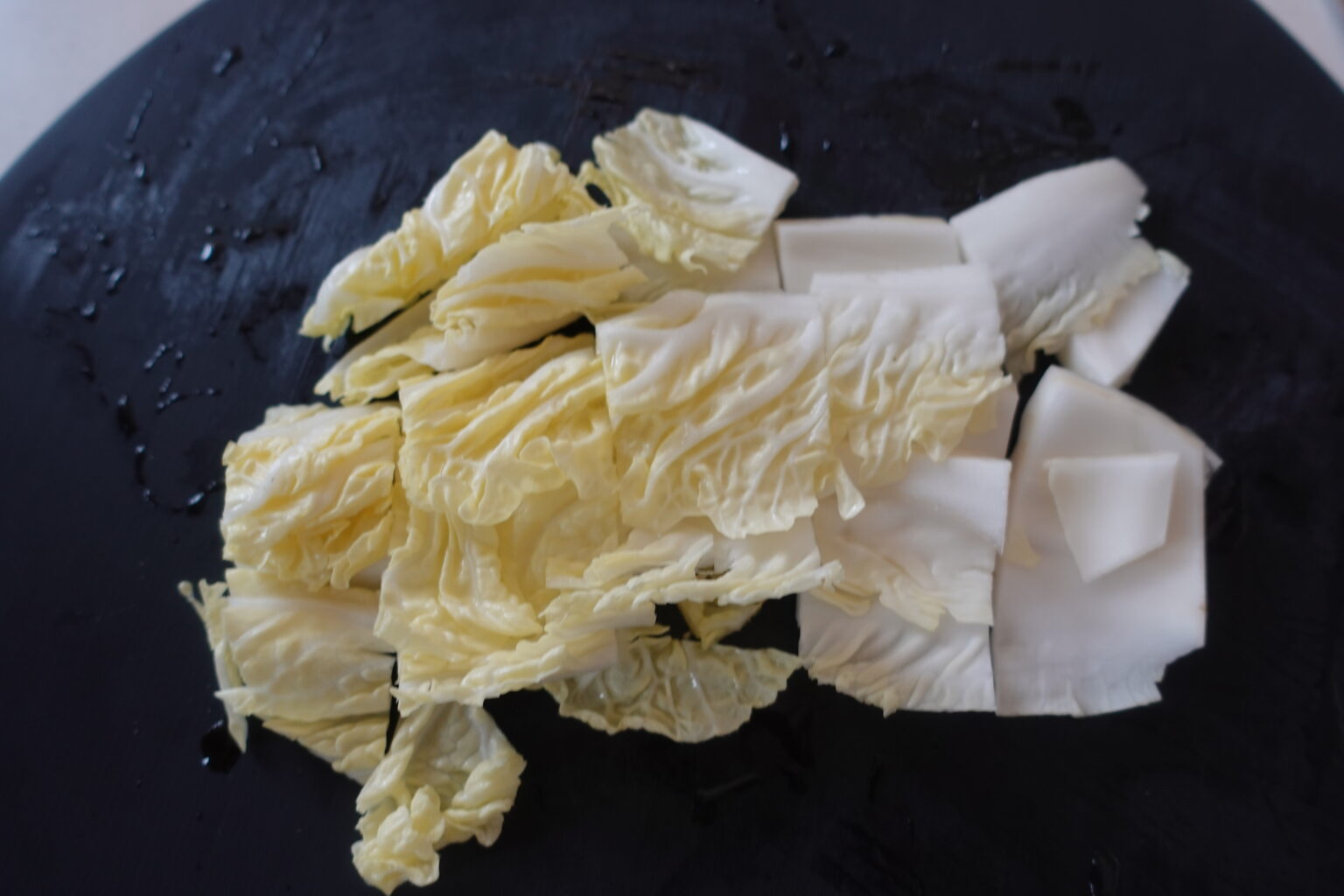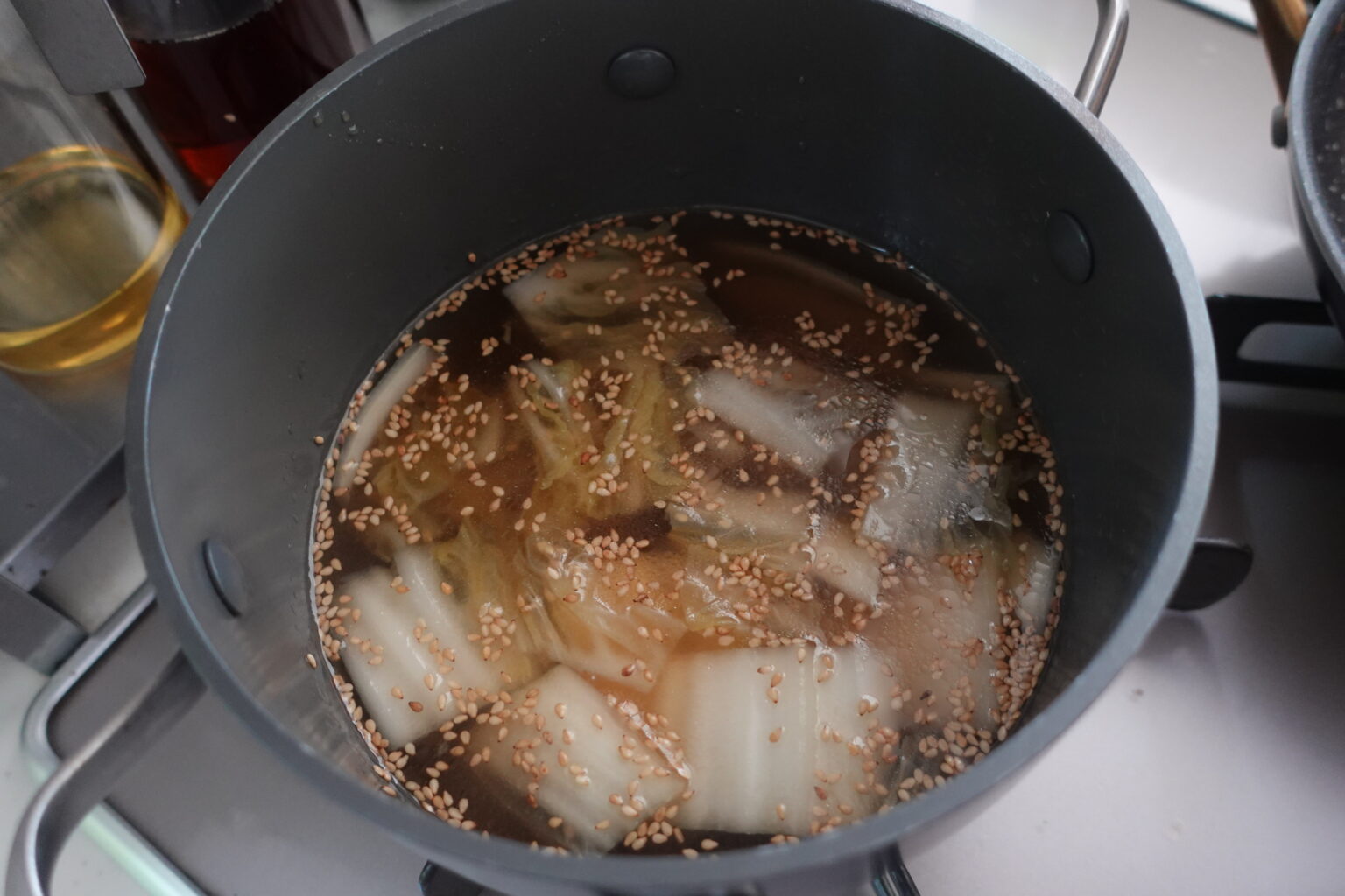 鍋にAを入れて中火にかけ、白菜を加えて蓋をして3~4分煮る。ごま油をたらし、白ごまを加えて混ぜる。