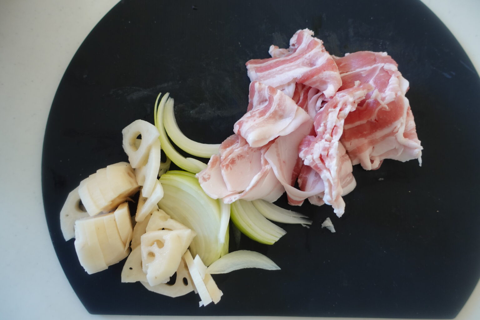 玉ねぎはくし切りにする。れんこんはピーラーで皮をむき7mm幅のいちょう切りにする。豚バラ肉は5cm幅に切る。