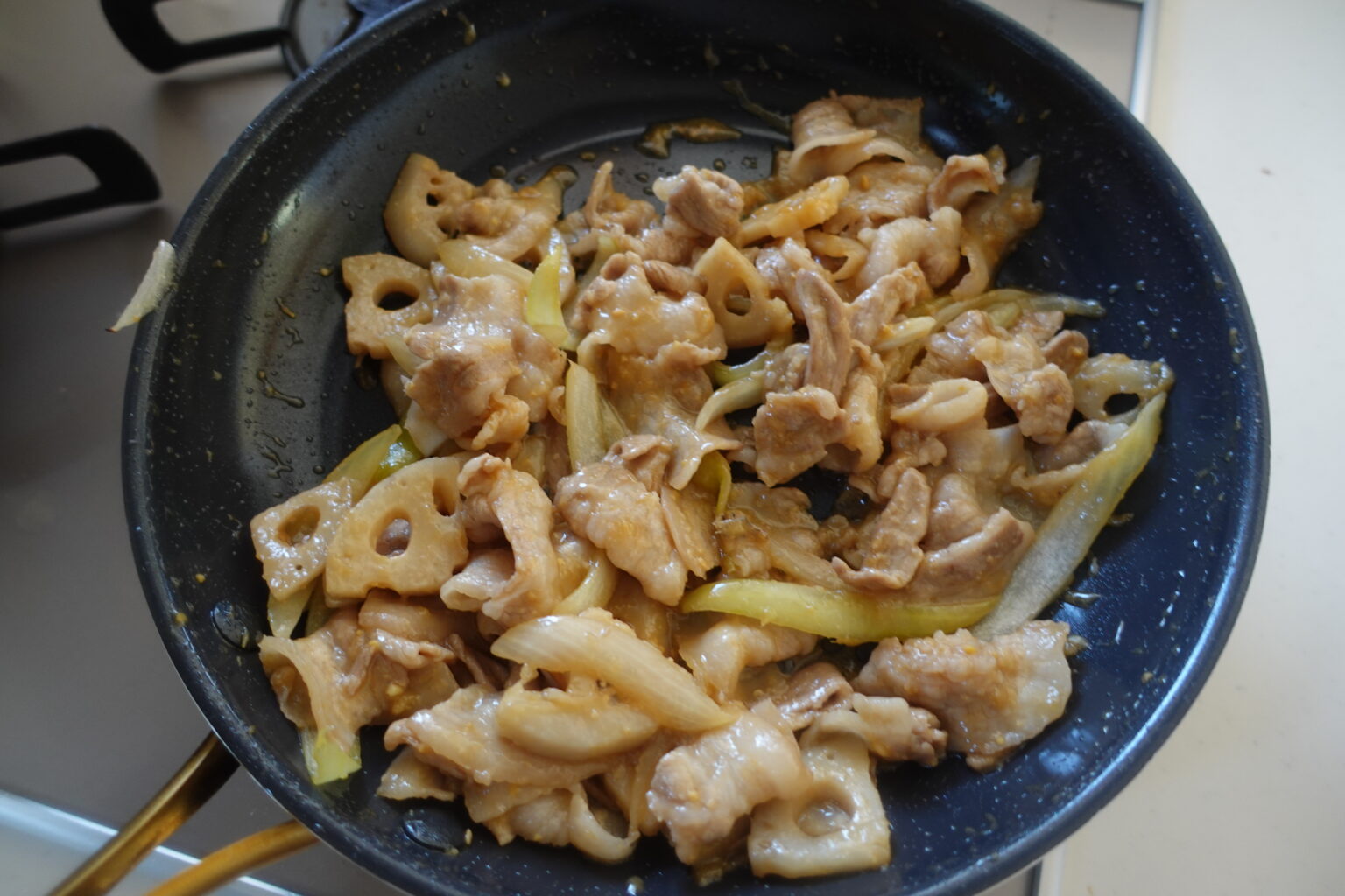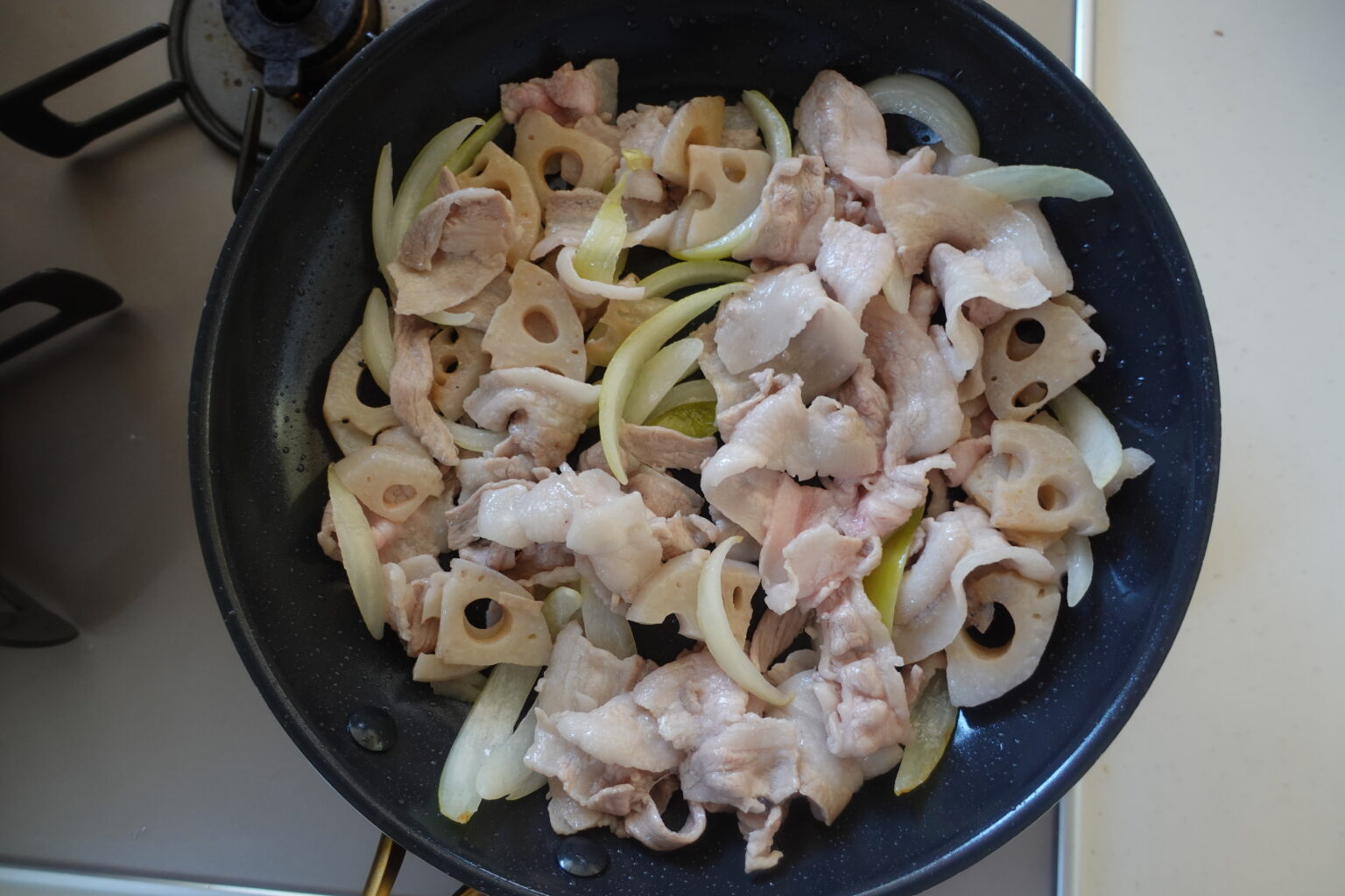 フライパンにうすく油をひいて熱し、玉ねぎとれんこんを中火で炒める。玉ねぎがしんなりしてれんこんに火が通ったら豚バラ肉を加えほぐしながら炒める。