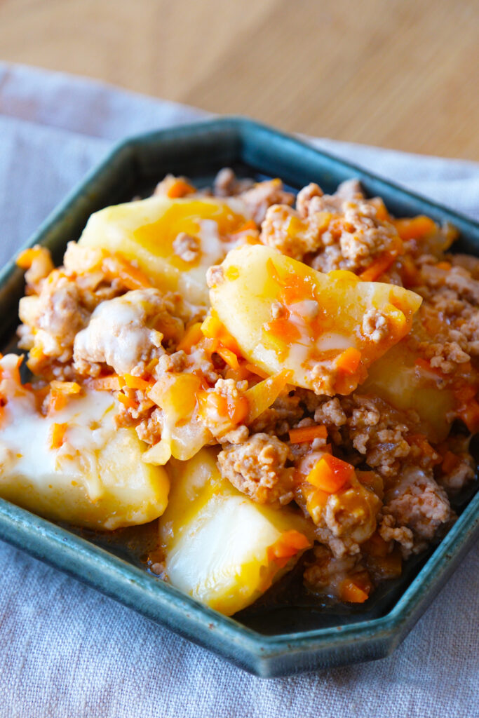 今夜のメインはトマト缶不要の「じゃがミートチーズ」。トマト缶を使わず、お家にある調味料で旨みたっぷりの濃厚なミートソース風に仕上げます◎ホクホクのじゃがいもに濃厚ミートソースととろ〜りチーズが絡み合う絶品おかずです♪子どもから大人まで喜ばれるメニューです!ぜひ作ってみてくださいね。
