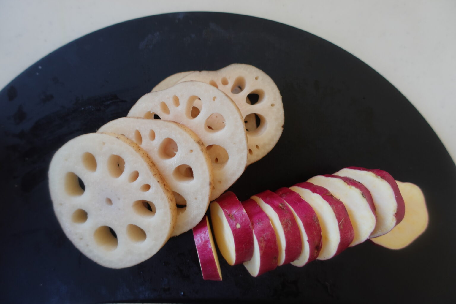 れんこんとさつまいもは皮をむかずに8mm幅に切る。