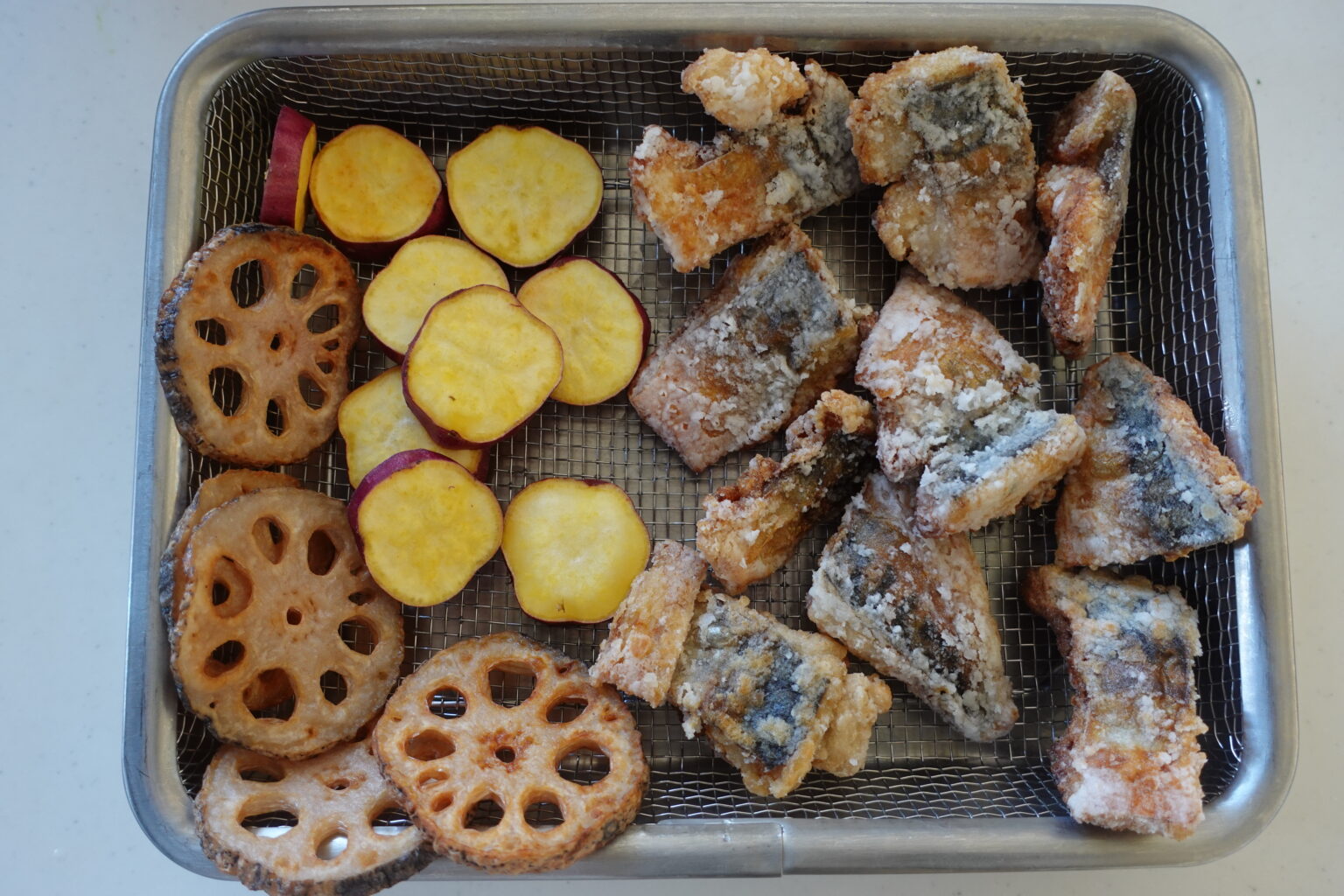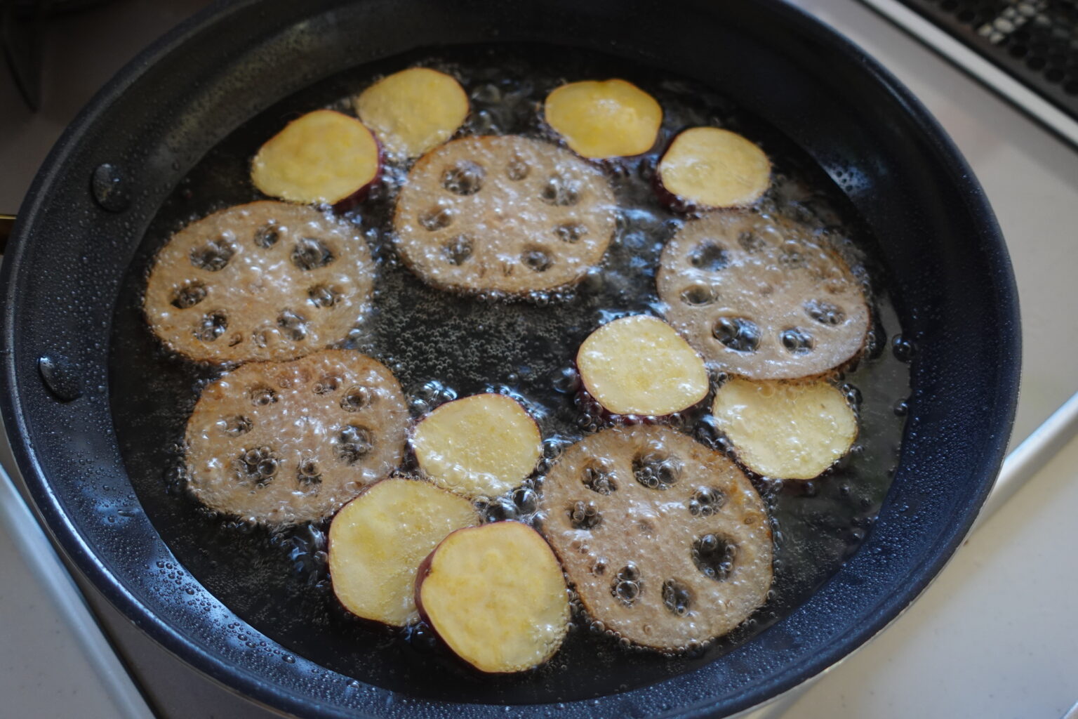 深めのフライパンに底2cmの油を入れて火にかける。菜箸を入れて細かい泡が出てきたら、水気をよくふき取ったさつまいもとれんこんを並べて素揚げにする。カラッと揚がったら、網付きバットにあげて油切りする。