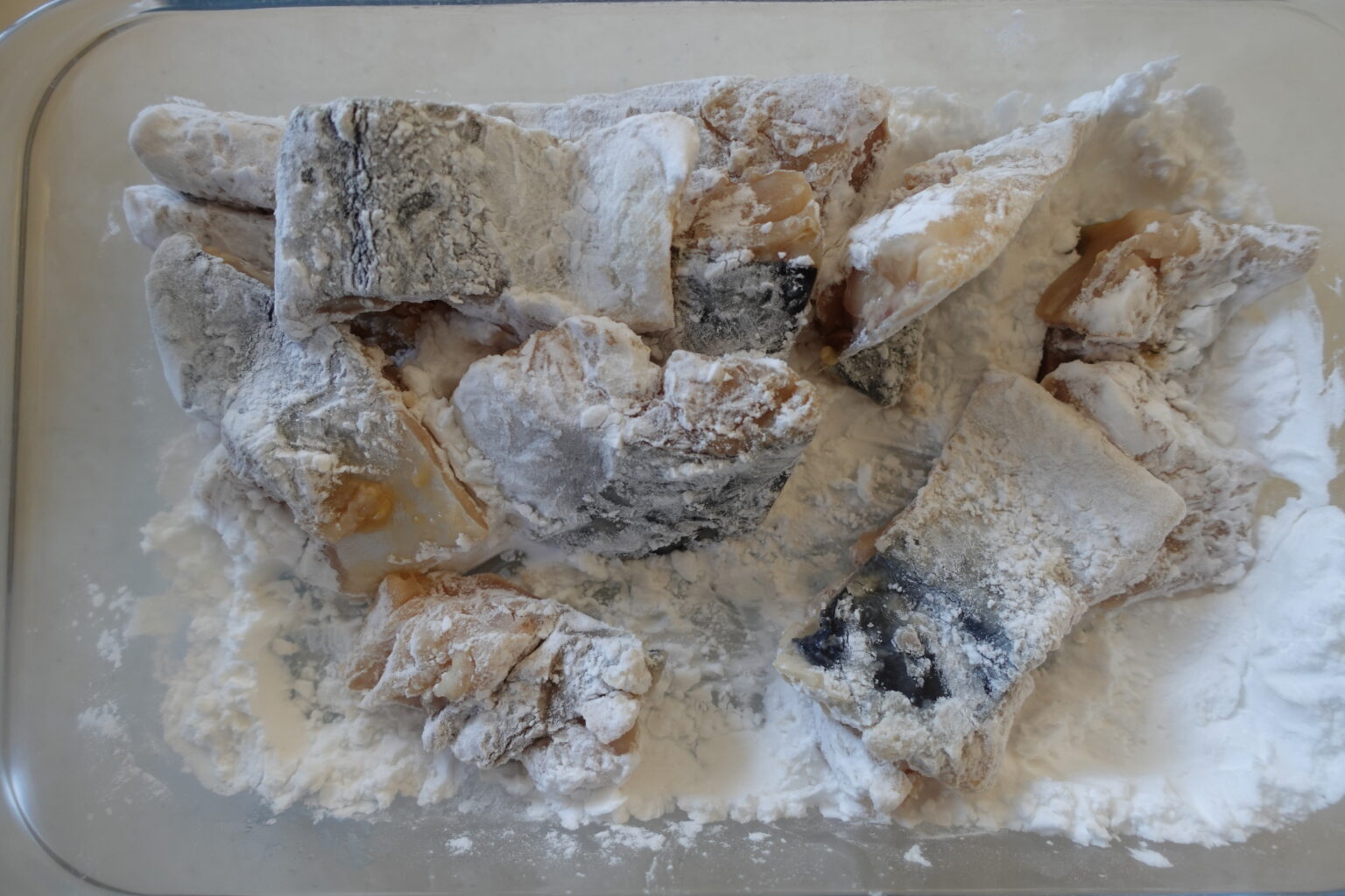 塩さばの表面についている水分をキッチンペーパーでふき取り、一口大に切る。ビニール袋入れ、Aを加えて揉みこむ。片栗粉をたっぷりまぶす。