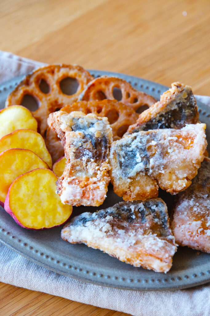 今夜の晩ごはんは外はカリッとジューシー♪塩さばの竜田揚げはいかがでしょうか。少ない油でカリッと香ばしい竜田揚げに仕上がります。旬を迎えたさつまいもやれんこんなど秋野菜を素揚げで添えました。脂がのった塩さばの濃い旨みと秋野菜の優しい甘みとホクホク食感のコントラストがたまらない一品です◎見栄えもよく、季節を感じる素敵な食卓になりますのでぜひ作ってみてくださいね。