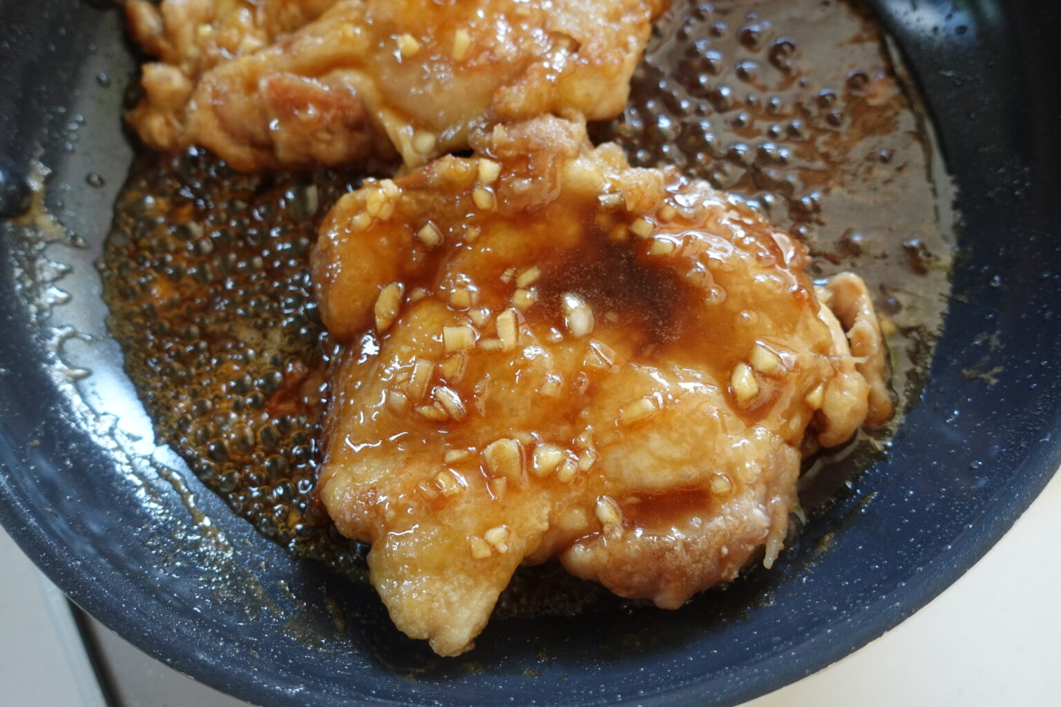 ・こんがり焼き目をつけるために、ヘラで鶏肉を押しながら焼きます