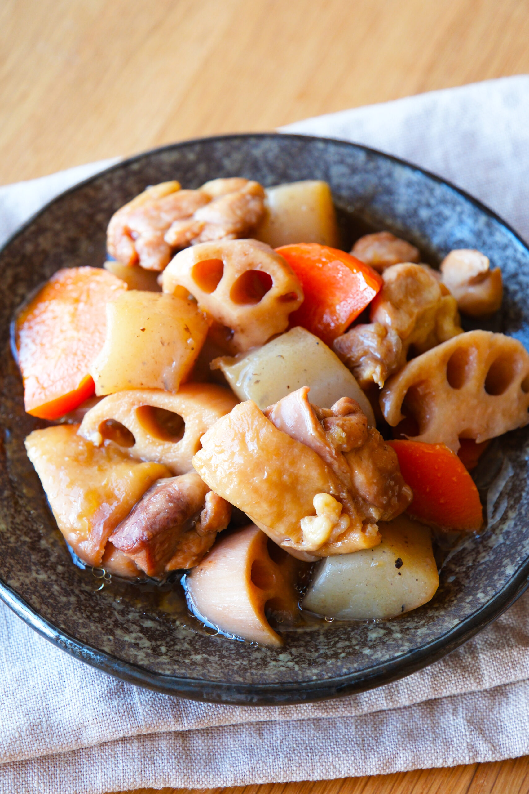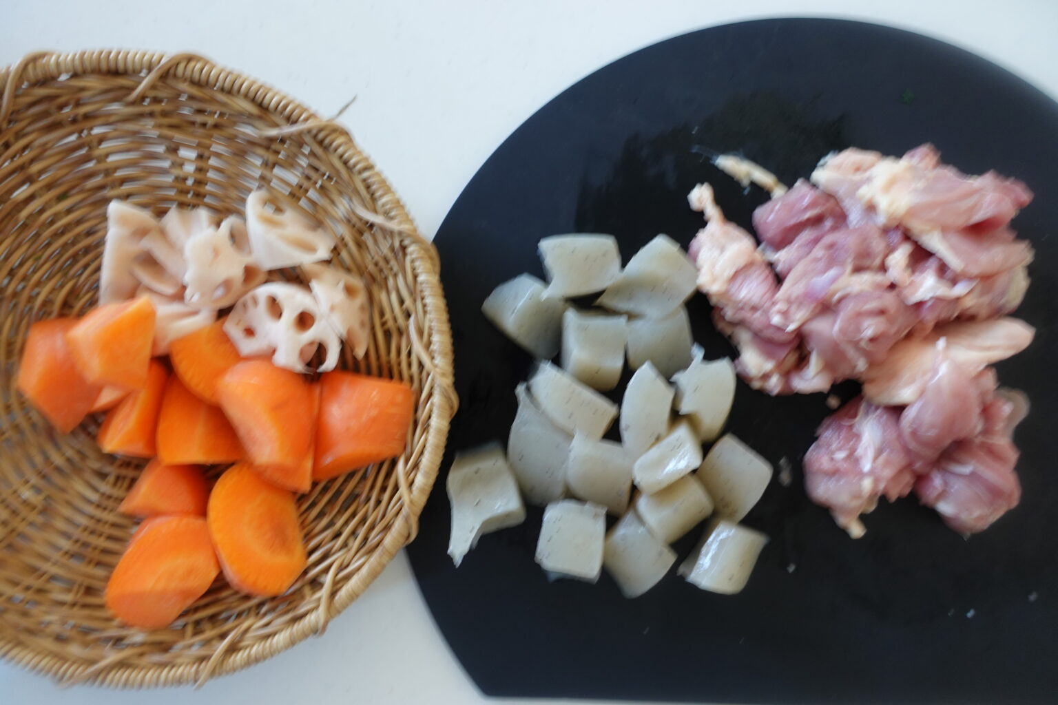 鶏もも肉は表面の水分をペーパータオルでふき取り、黄色い脂肪や筋を取り除き、ひと口大に切る。れんこんはピーラでーで皮をむき乱切りにする。にんじんは小さめの乱切りにする。こんにゃくはスプーンでひと口大にちぎる。