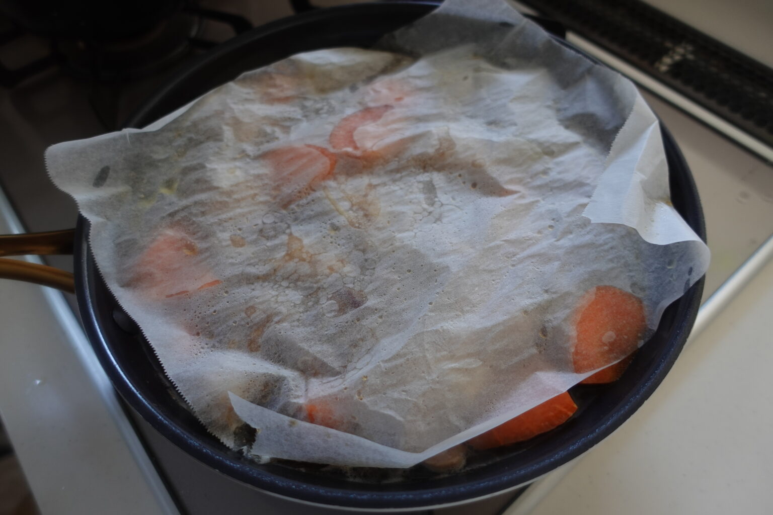 落し蓋を外し、中火で汁気を飛ばすように煮詰める(5分)。