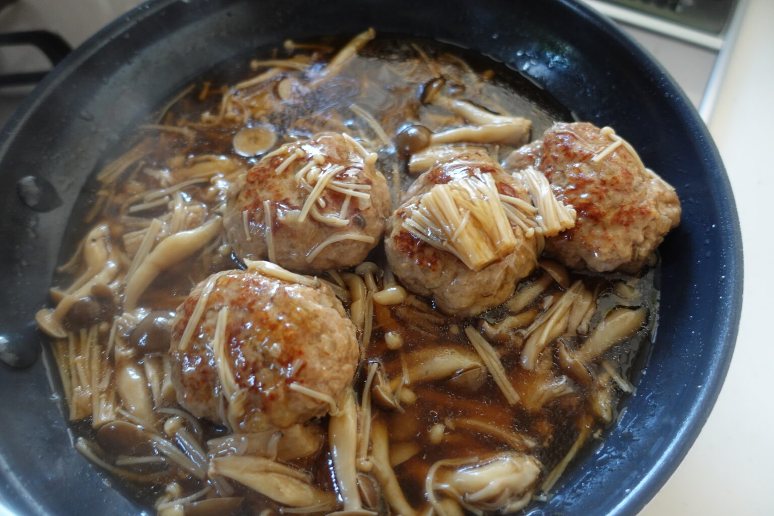 今夜のメインはふっくらジューシー「和風おろしきのこハンバーグ」。旨味たっぷりのきのこソースと大根おろしで後味さっぱり。