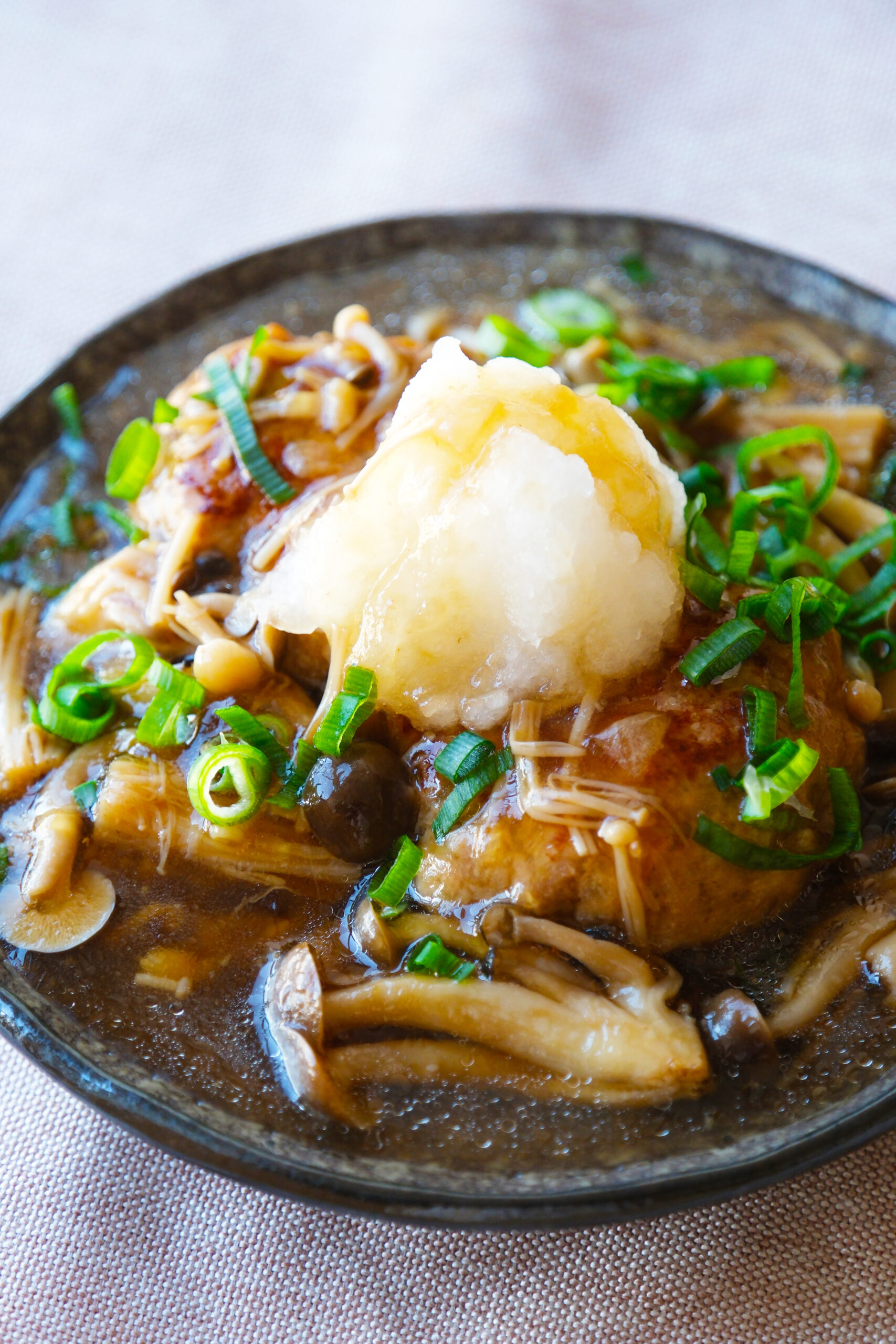 きのこに含まれる食物繊維はお肉の消化を助けるだけでなく、毎日の腸活をサポート♪しめじやえのきなど数種のきのこのシャキシャキ感と、大根おろしのみずみずしさのおかげで、最後まで飽きずにおいしくお召し上がりいただけます♪