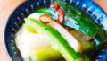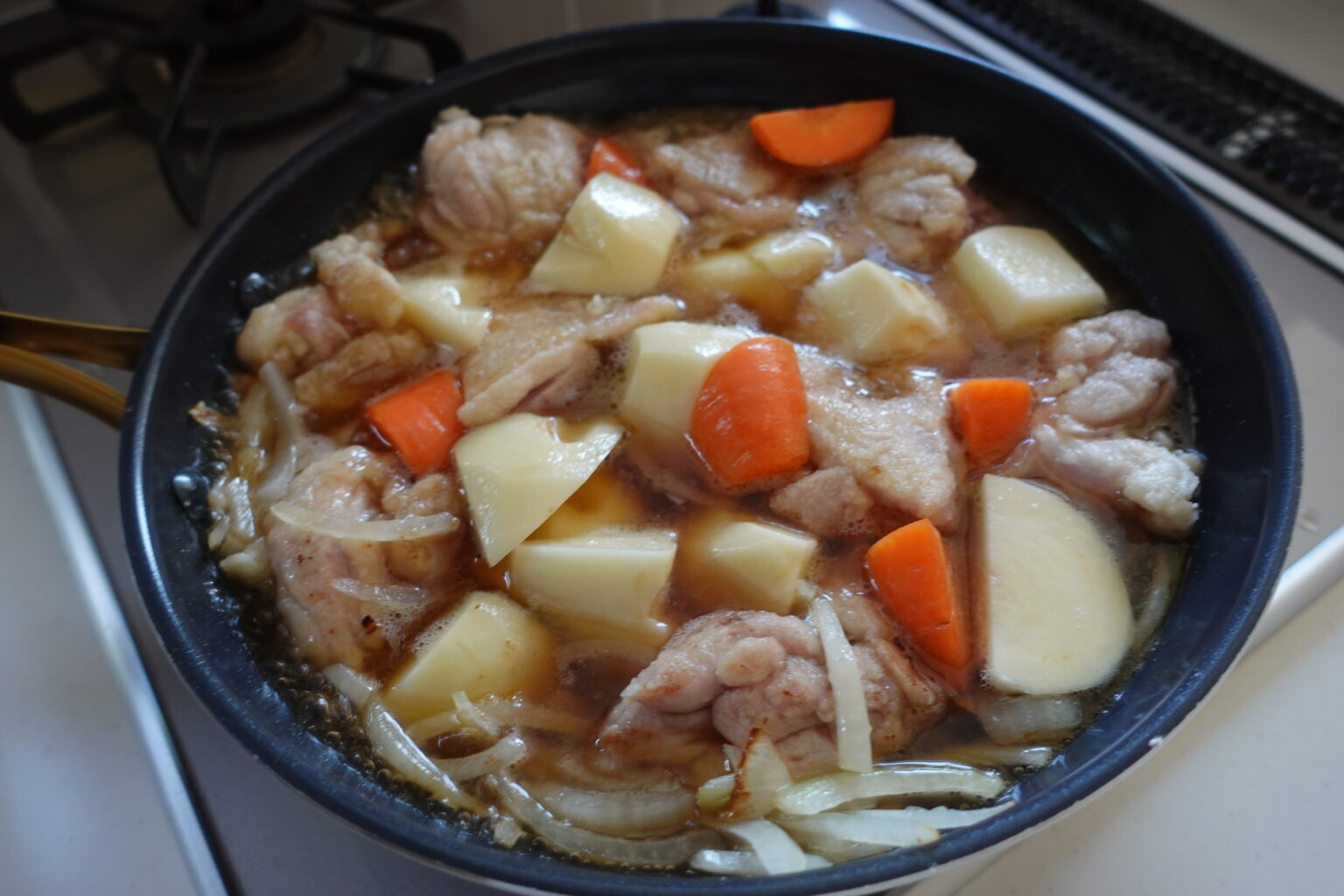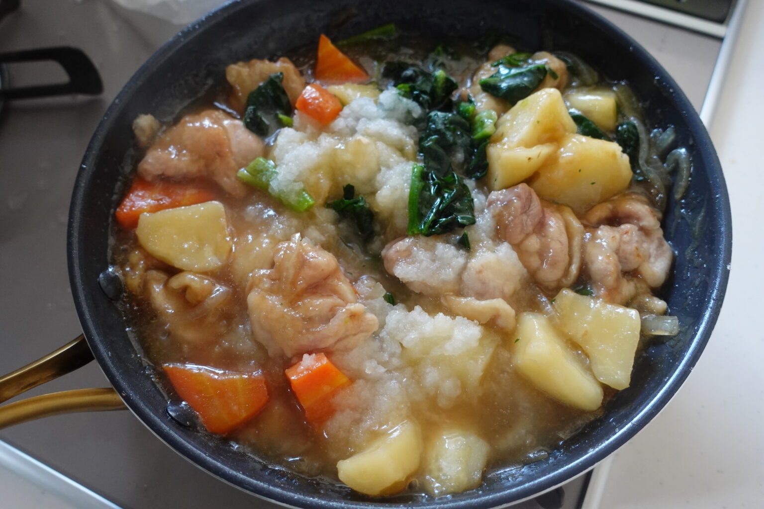 鶏もも肉に焼き目がついたら、じゃがいも、人参、Aを加えて煮立たせ、落し蓋をして約10分煮る。冷凍ほうれん草と大根おろしを加えてさっと煮る。