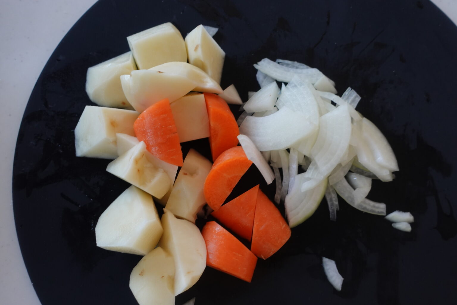 じゃがいもは皮をむいて小さめの乱切り。人参も小さめの乱切りにする。耐熱容器にいれてふんわりとラップを、電子レンジ600W3分加熱する。