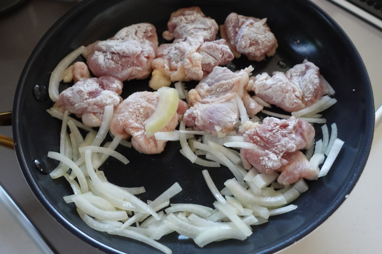 フライパンに油を中火で熱し、鶏もも肉の皮目を下にして並べ炒める。その横で玉ねぎを炒める。