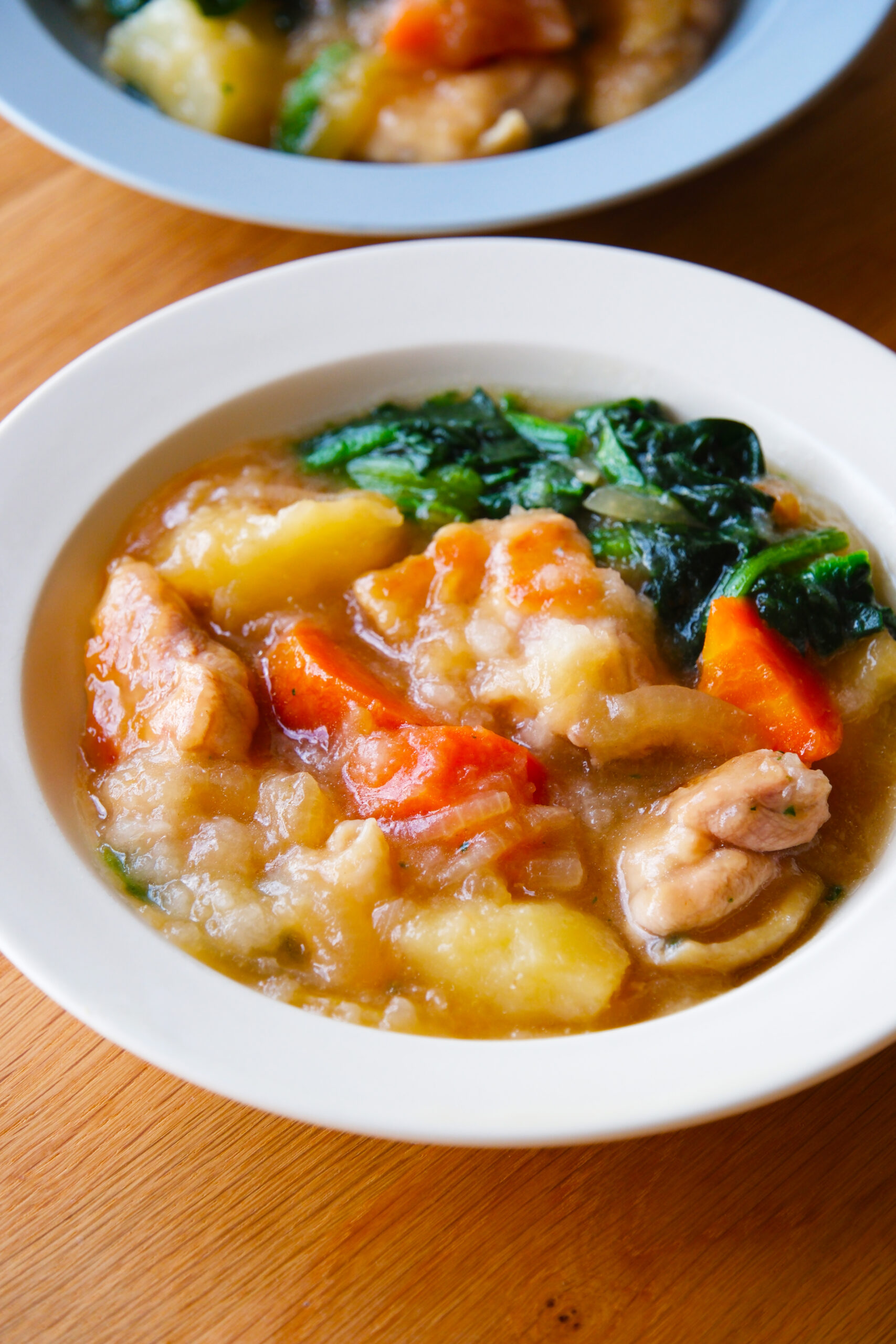 鶏もも肉に焼き目がついたら、じゃがいも、人参、Aを加えて煮立たせ、落し蓋をして約10分煮る。冷凍ほうれん草と大根おろしを加えてさっと煮る。