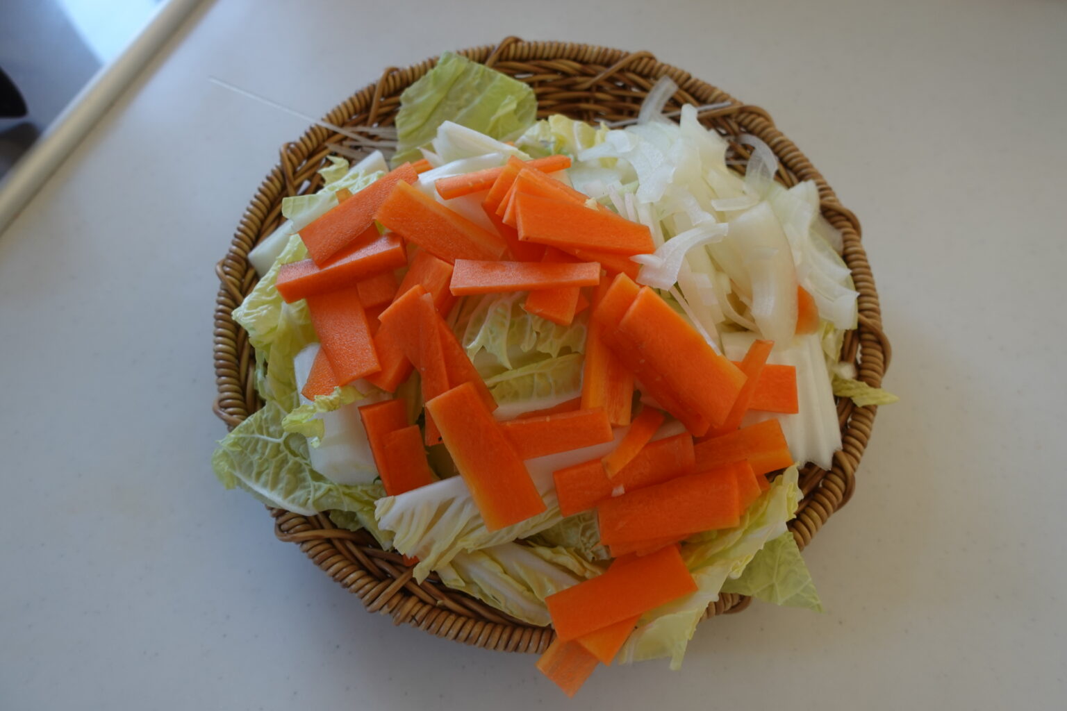 白菜は3cm幅のざく切りにする。玉ねぎは薄切りにする。にんじんは短冊切りにする。ぶなしめじは石づきを切り落とし小房に分ける。