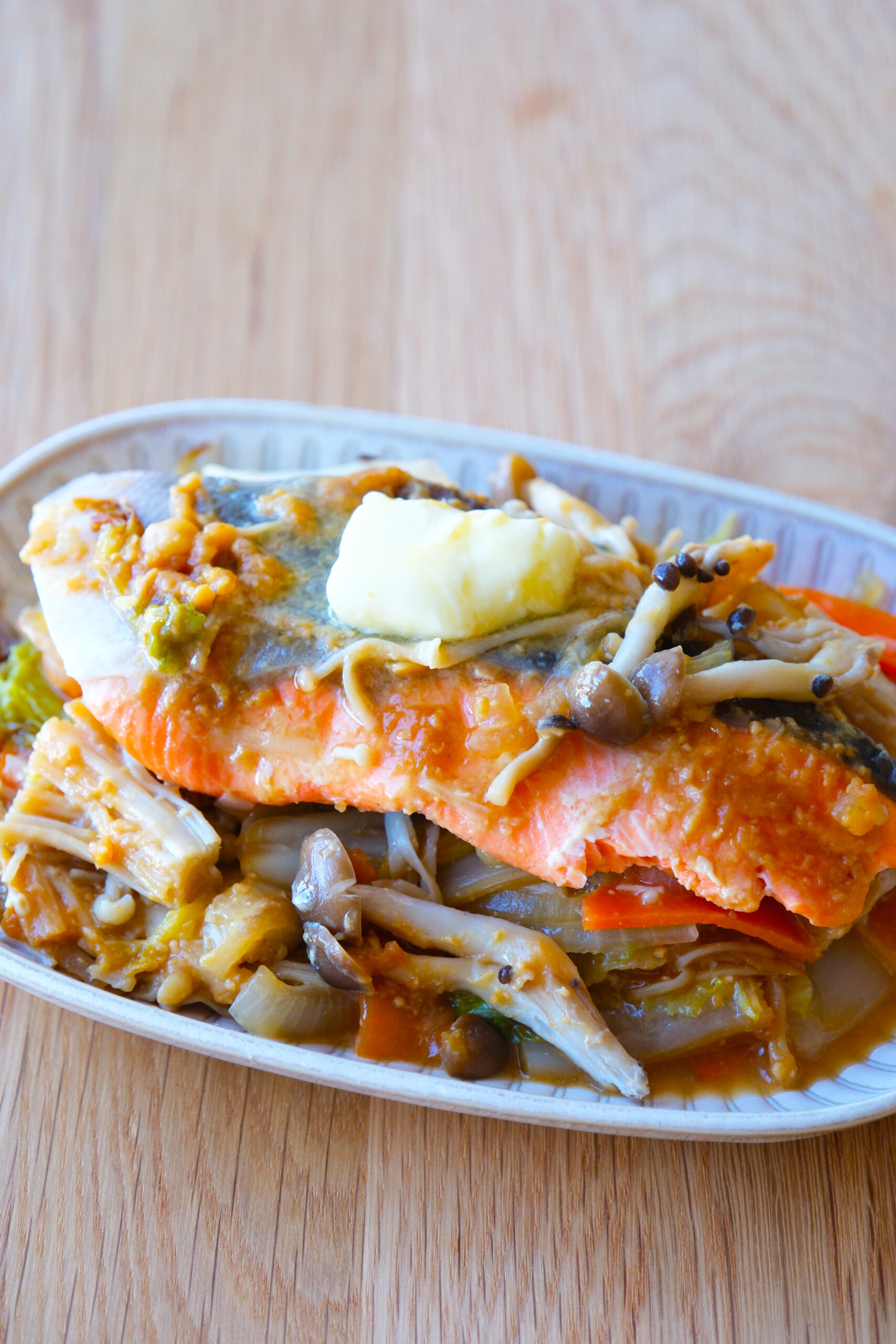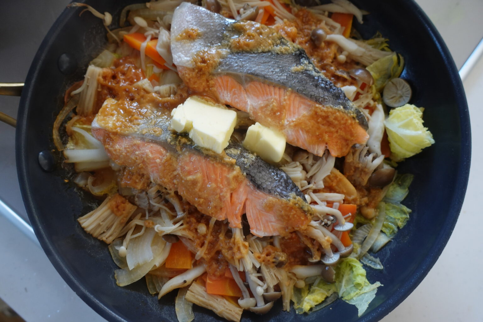 今夜のメインは「鮭のちゃんちゃん焼き」。今週残った野菜を使って無駄なくおいしく使い切ります!フライパンに野菜と鮭を並べたら特製みそだれをかけて蒸し焼きにするだけ!野菜の甘みと鮭の旨みが味噌だれと絡み合い、食欲をそそる香りが広がります◎準備も片付けも簡単なので忙しい日の夕食にもぴったりです!