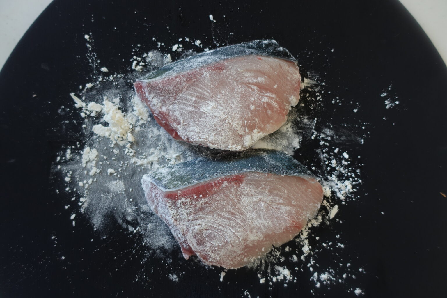 ブリの切り身は表面についている水分をペーパータオルで拭きとる。片栗粉を薄くまぶす。