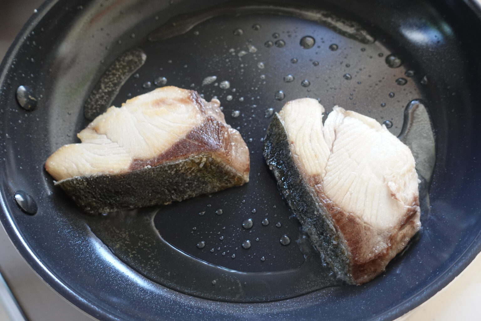 フライパンに油を熱し、ブリの皮目を下にして並べて中火で焼く。焼き色がついたら裏っ返し、裏面も焼き色をつける。