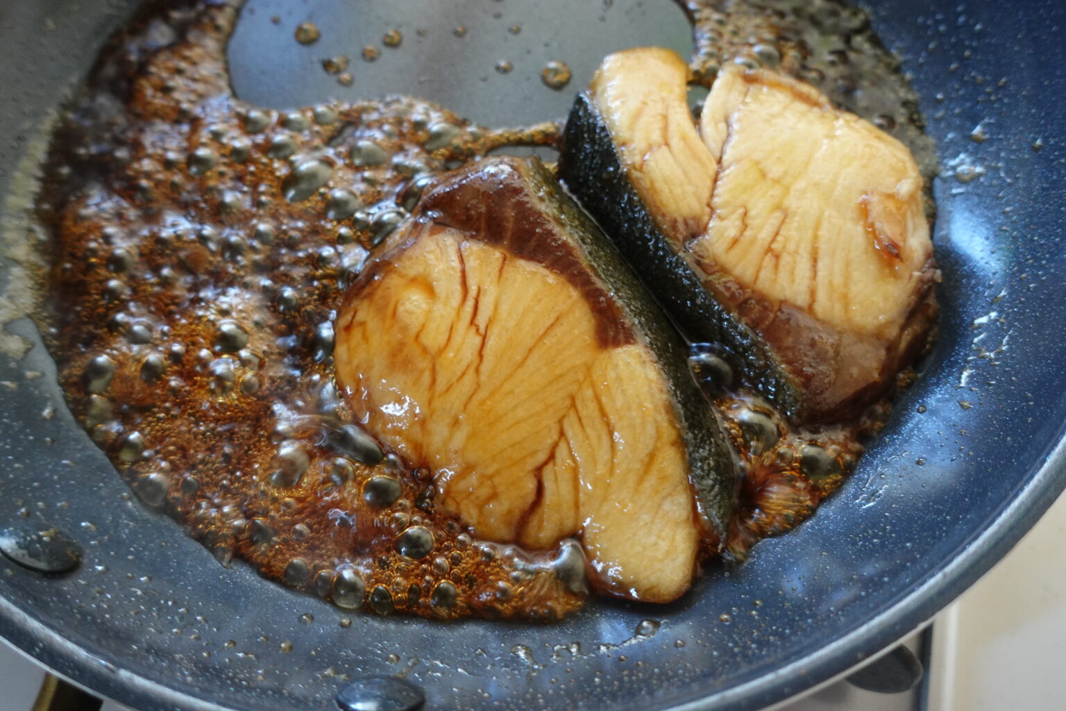 ブリに火が通ったら、余分な油をペーパータオルで拭きとる。Aを加えてとろみがつくまで煮詰める。煮詰まってきたらスプーンでたれをすくってかけるを繰り返す。
