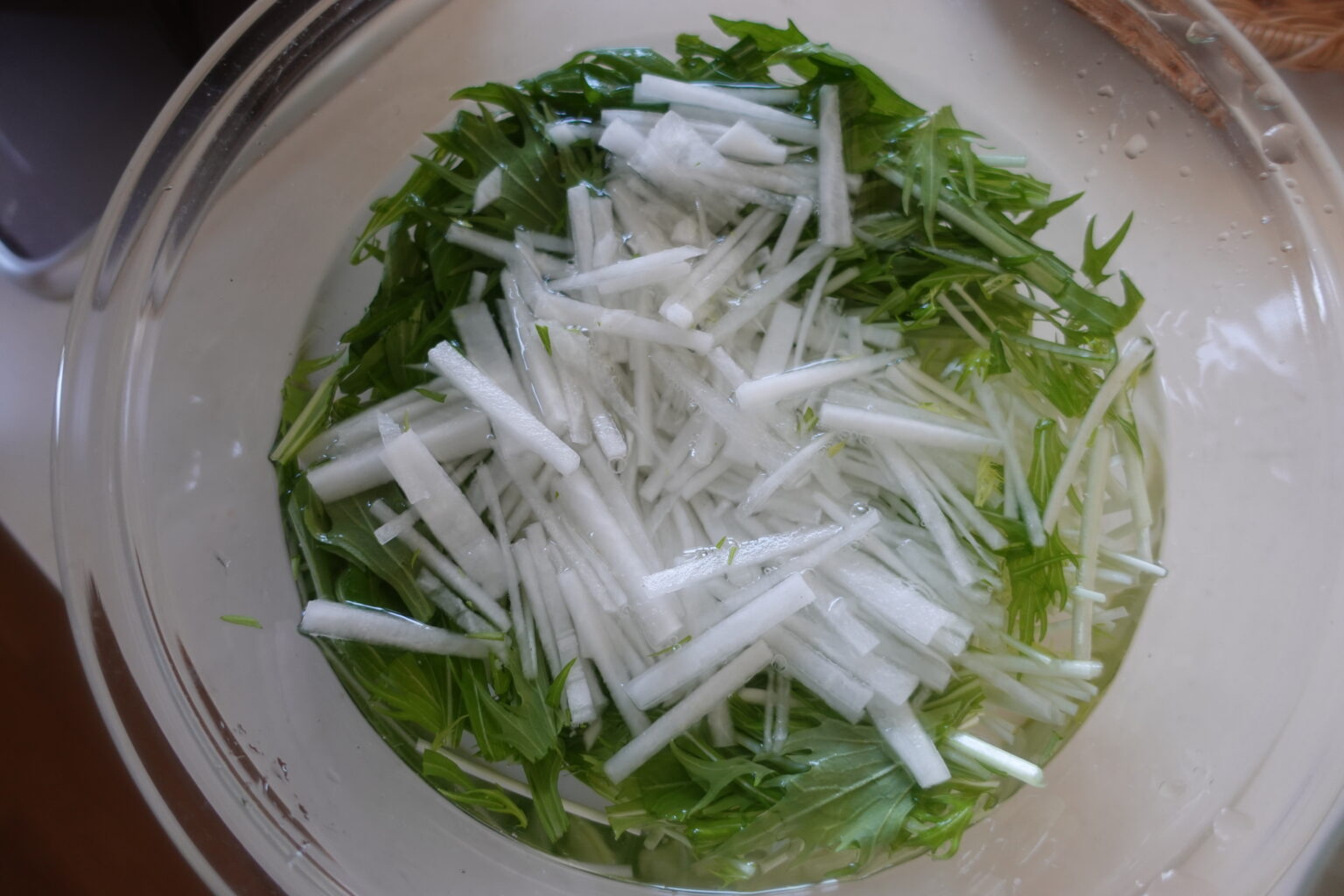 ・水菜と大根は水にさらすことでパリッとした食感に仕上がります&大根は辛み成分やアクを抜くことができます。