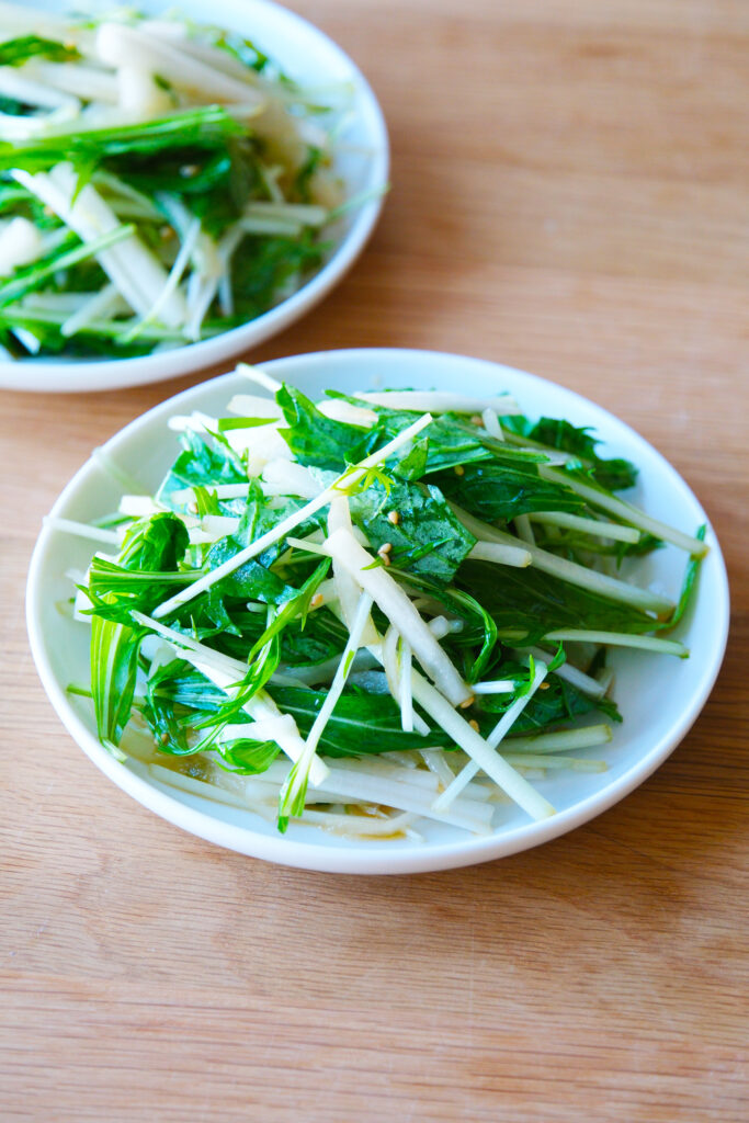 あと一品は「大根と水菜の和風サラダ」。旬の大根と水菜のシャキシャキとした食感が心地よい簡単でヘルシーな和風サラダです。ごま油の香りと醤油ベースのドレッシングで、さっぱりとしながらも奥深い旨味が楽しめます。