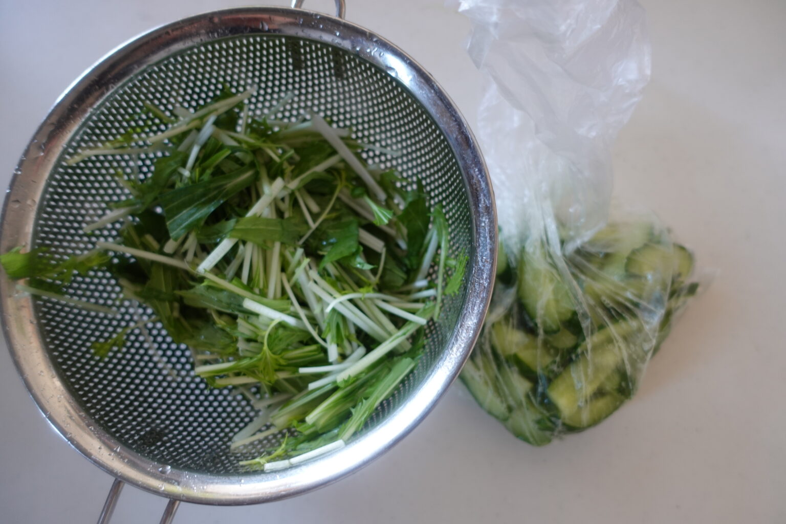 ・きゅうりは塩もみして余分な水分を抜くことで、時間が経っても水っぽくならず、パリッとした歯切れの良さをキープ。ポン酢の味がしっかりと馴染みます。