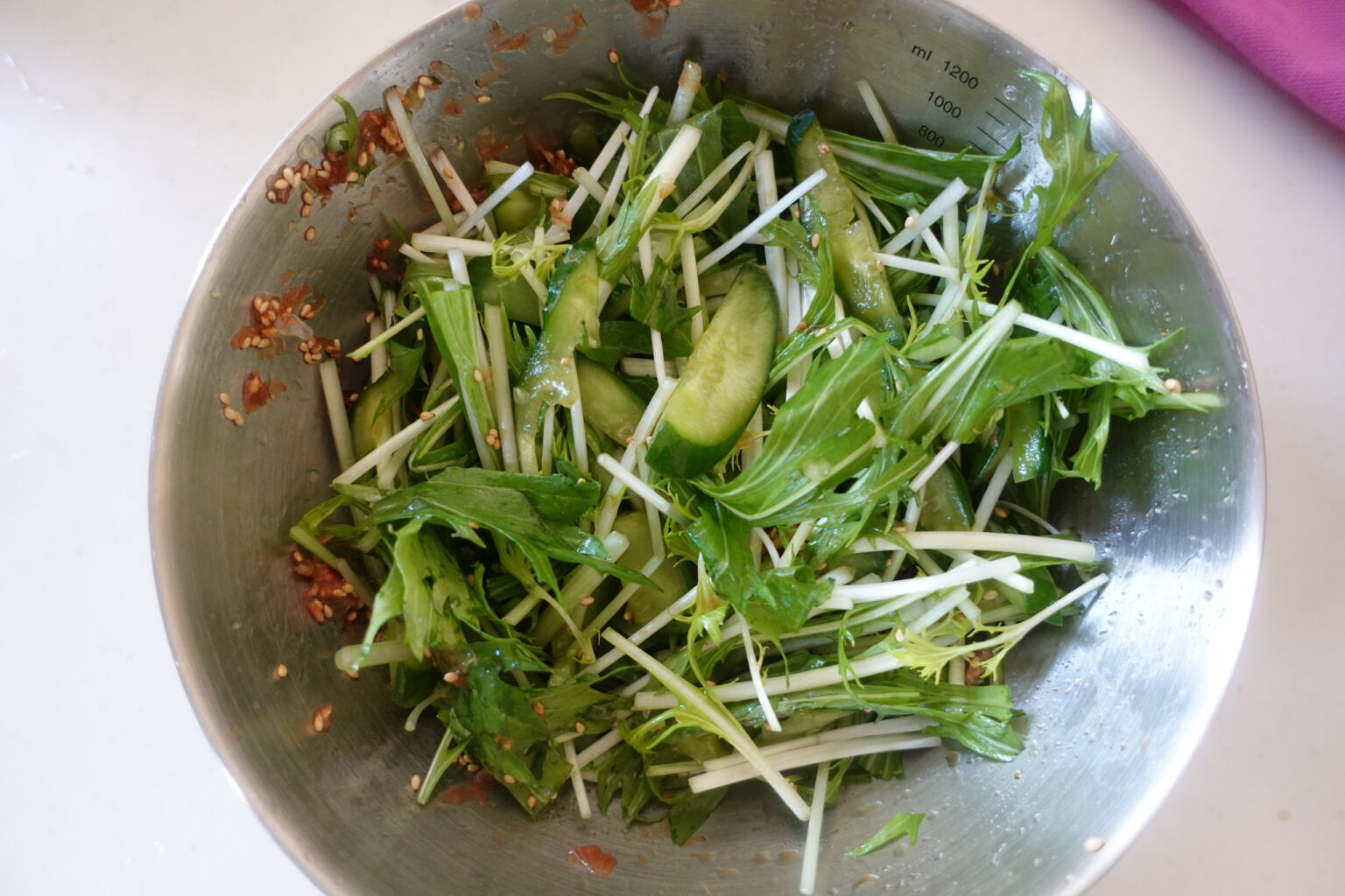 ボウルにAを合わせてよく混ぜ、水菜ときゅうりを加えて和える。