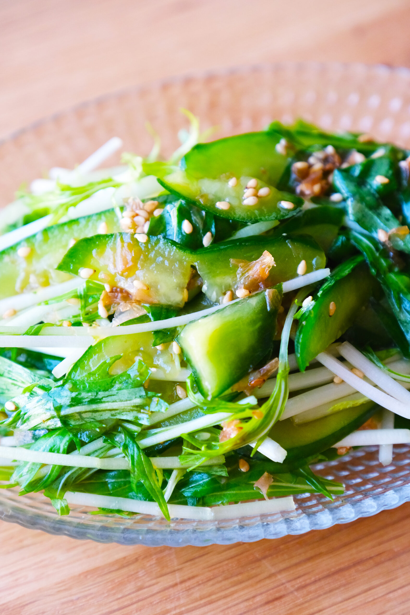 甘辛い煮物には「水菜ときゅうりのさっぱりポン酢サラダ」を。口の中をリフレッシュしてくれます◎水菜ときゅうりのシャキシャキ食感を最大限に引き出した、シンプルながら後引くおいしさです◎