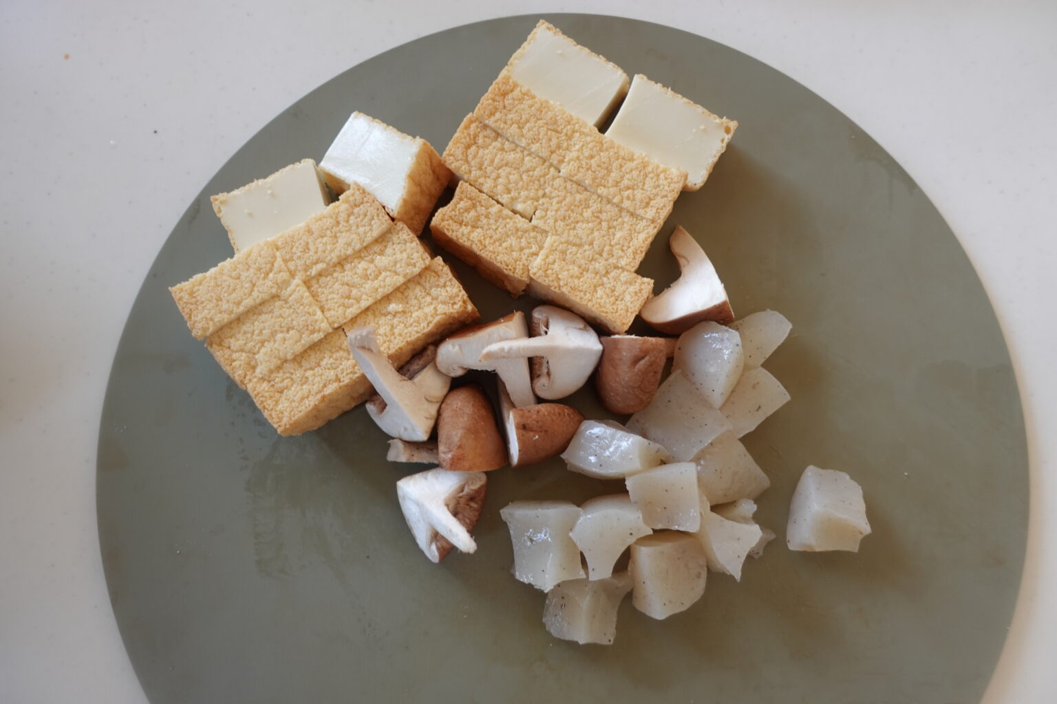 厚揚げはひと口大にちぎる。こんにゃくはスプーンでひと口大にちぎる。椎茸は軸を切り落とし、4等分に切る。