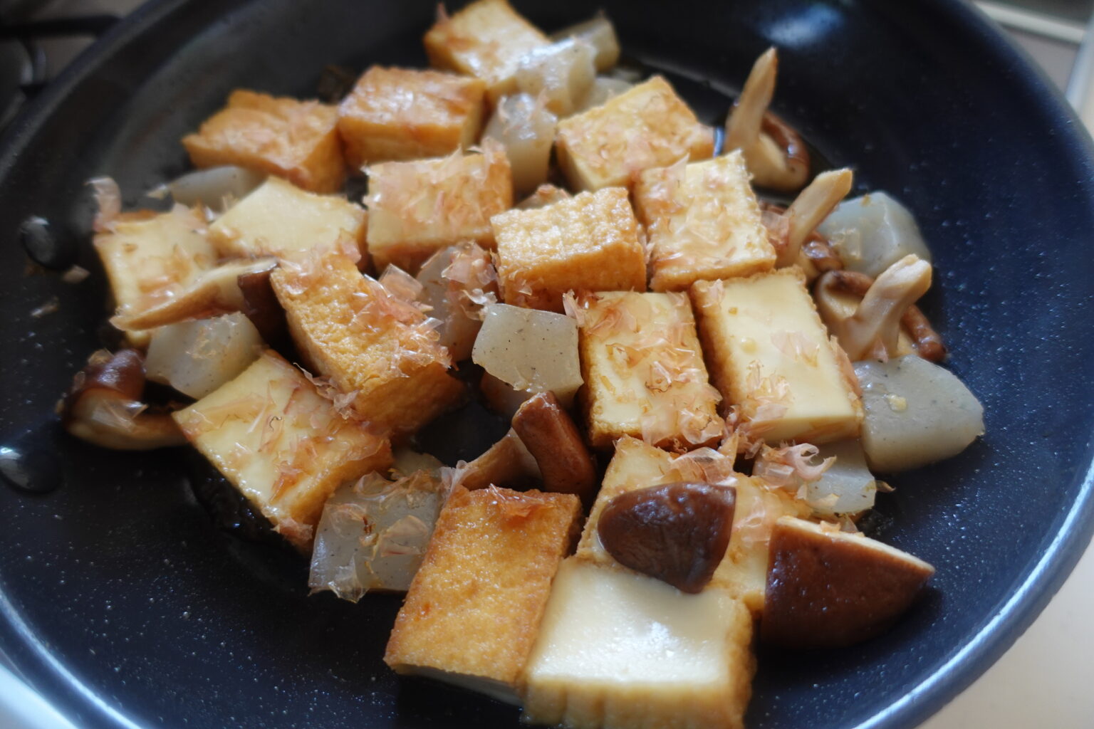今夜のメインのおかずは「厚揚げこんにゃくのおかか炒め煮」を作ります♪厚揚げは植物性タンパク質が豊富でこんにゃくは低カロリー・食物繊維たっぷり◎食べ応えがあるのにヘルシーで年末年始の暴食におすすめのレシピです。七味唐辛子でピリッとさせれば、おつまみにも大活躍◎ぜひ作ってみてくださいね!