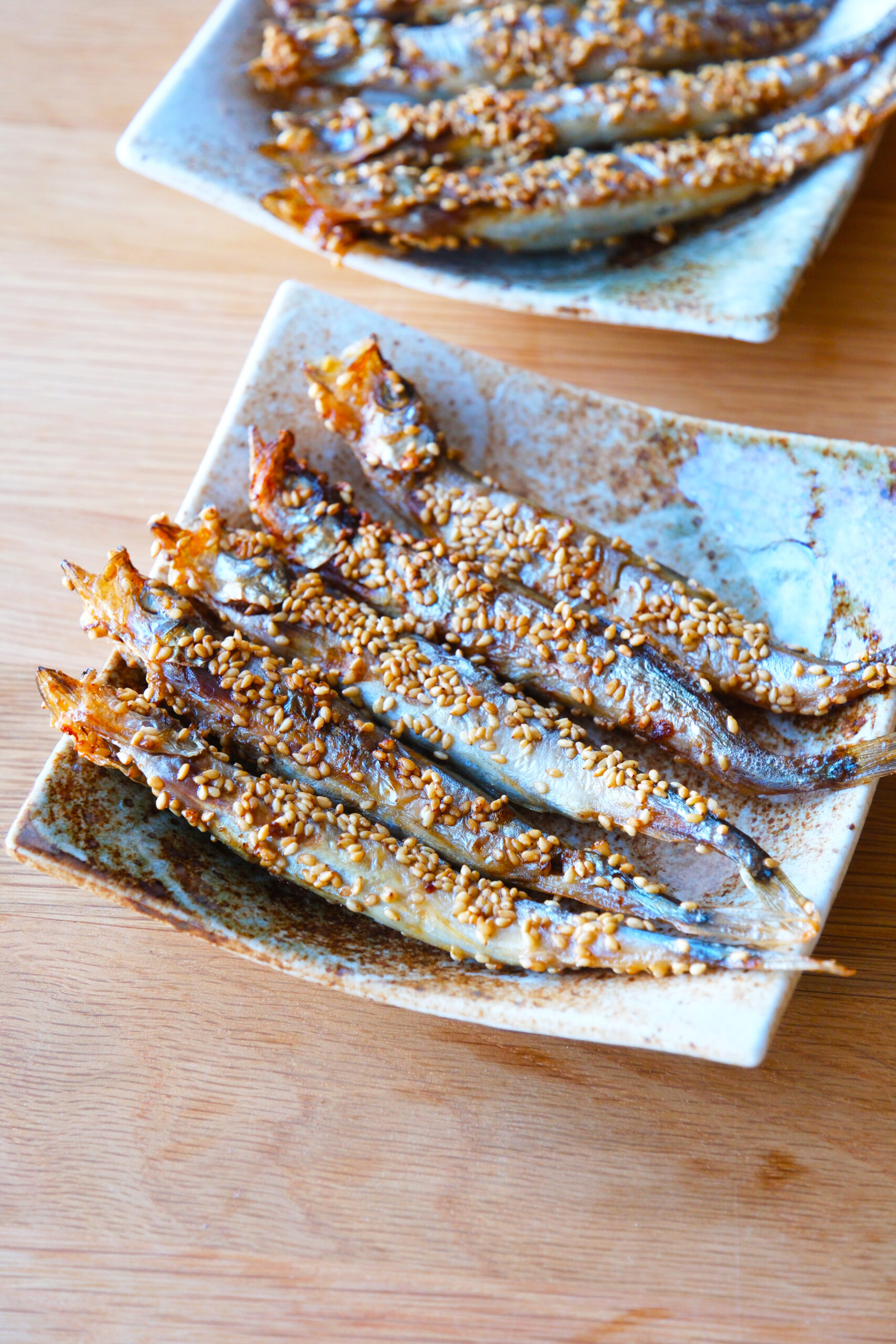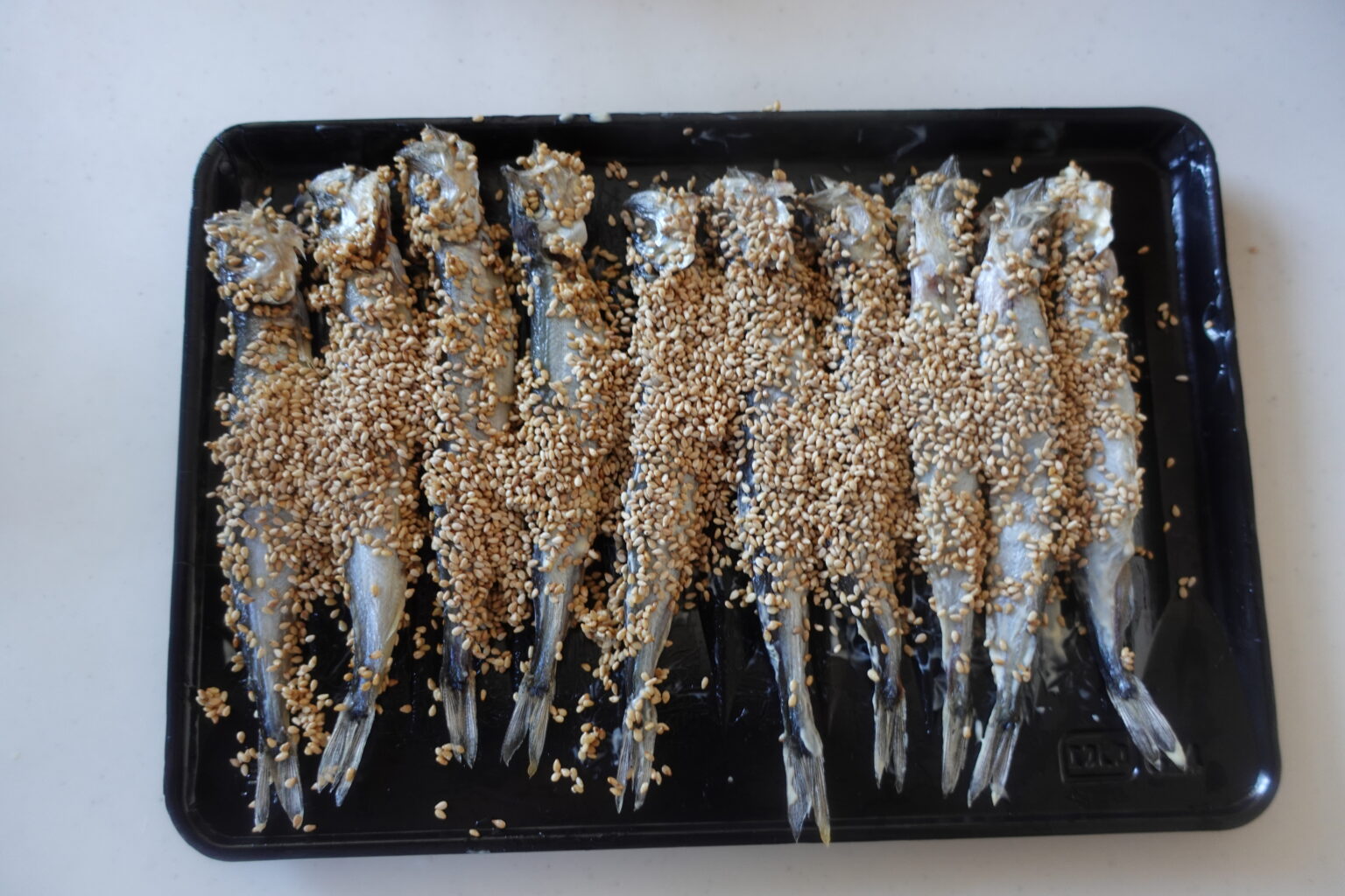 子持ちししゃもにマヨネーズをぬり、白いりごまをたっぷりとふりかけてまぶす。